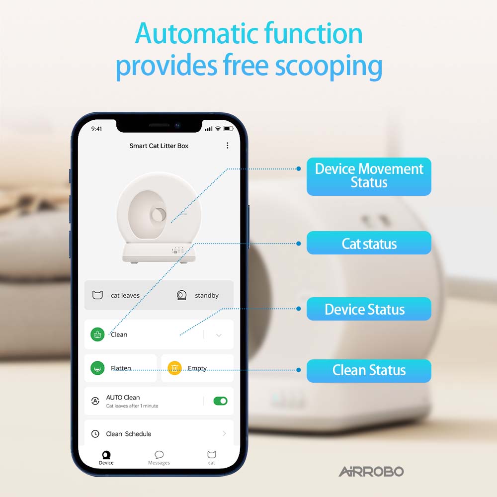- 從清砂到清潔機器,絲毫不費力,一鍵清砂,自動感應清潔,也可通過 APP 設置,支持智慧清潔規劃