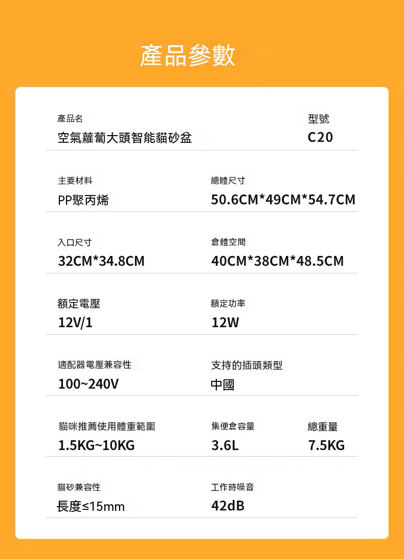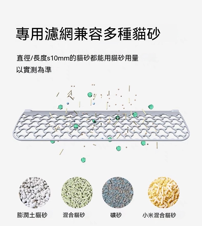 - 貓砂相容性:長度 ≤ 15mm