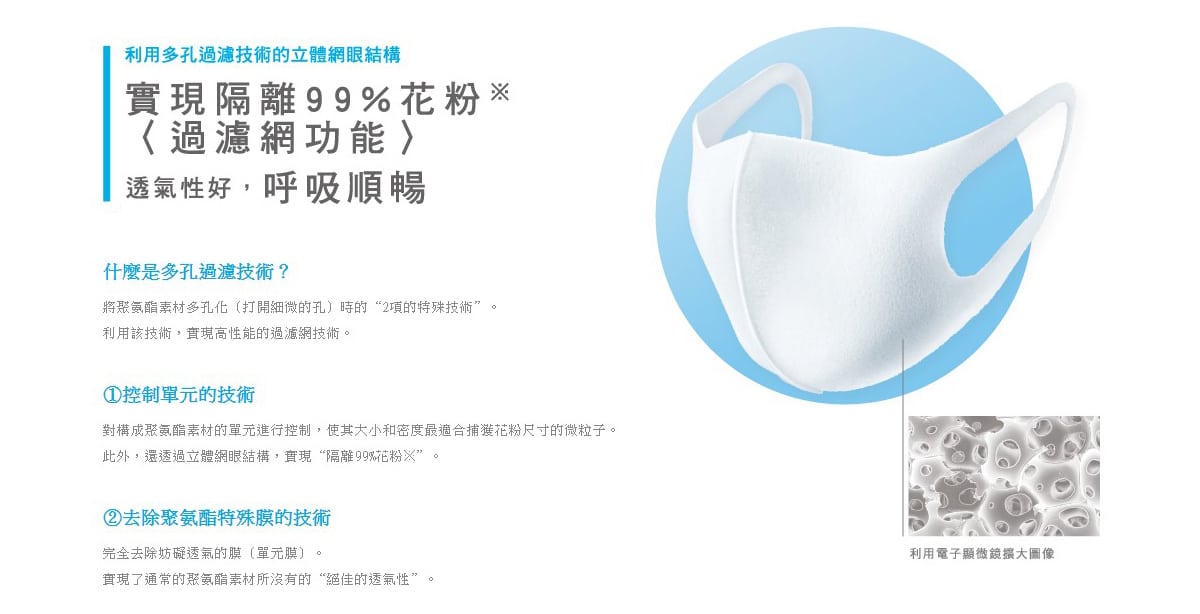 - 控制單元的技術:對構成聚氨酯素材的單元進行控制,使其大小和密度最適合捕獲花粉尺寸的微粒子。此外,還透過立體網眼結構,實現 “隔離 99% 花粉※”。