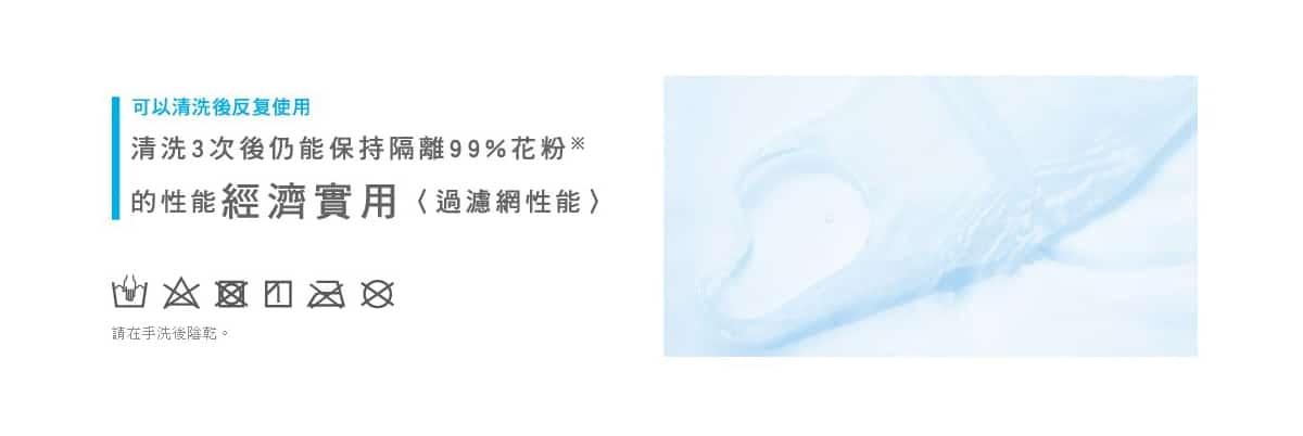 - 清洗 3 次後仍能保持隔離 99% 花粉※,因此非常經濟實惠。