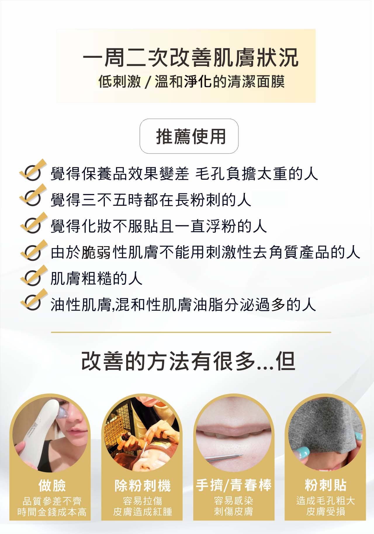 - 乾性、敏感肌膚:一週使用 1 次,幫助角質代謝,清理髒污,幫助保養品吸收,妝容更服貼
