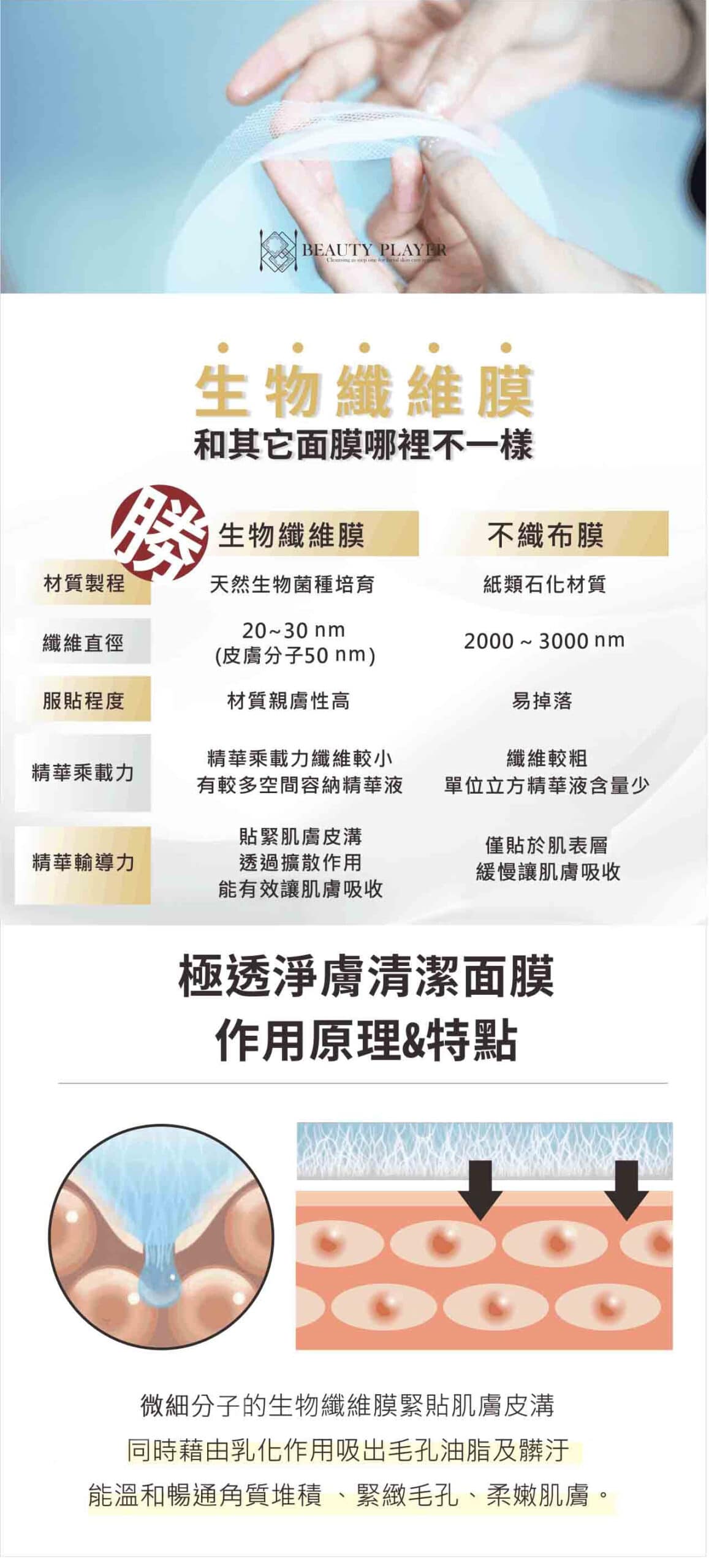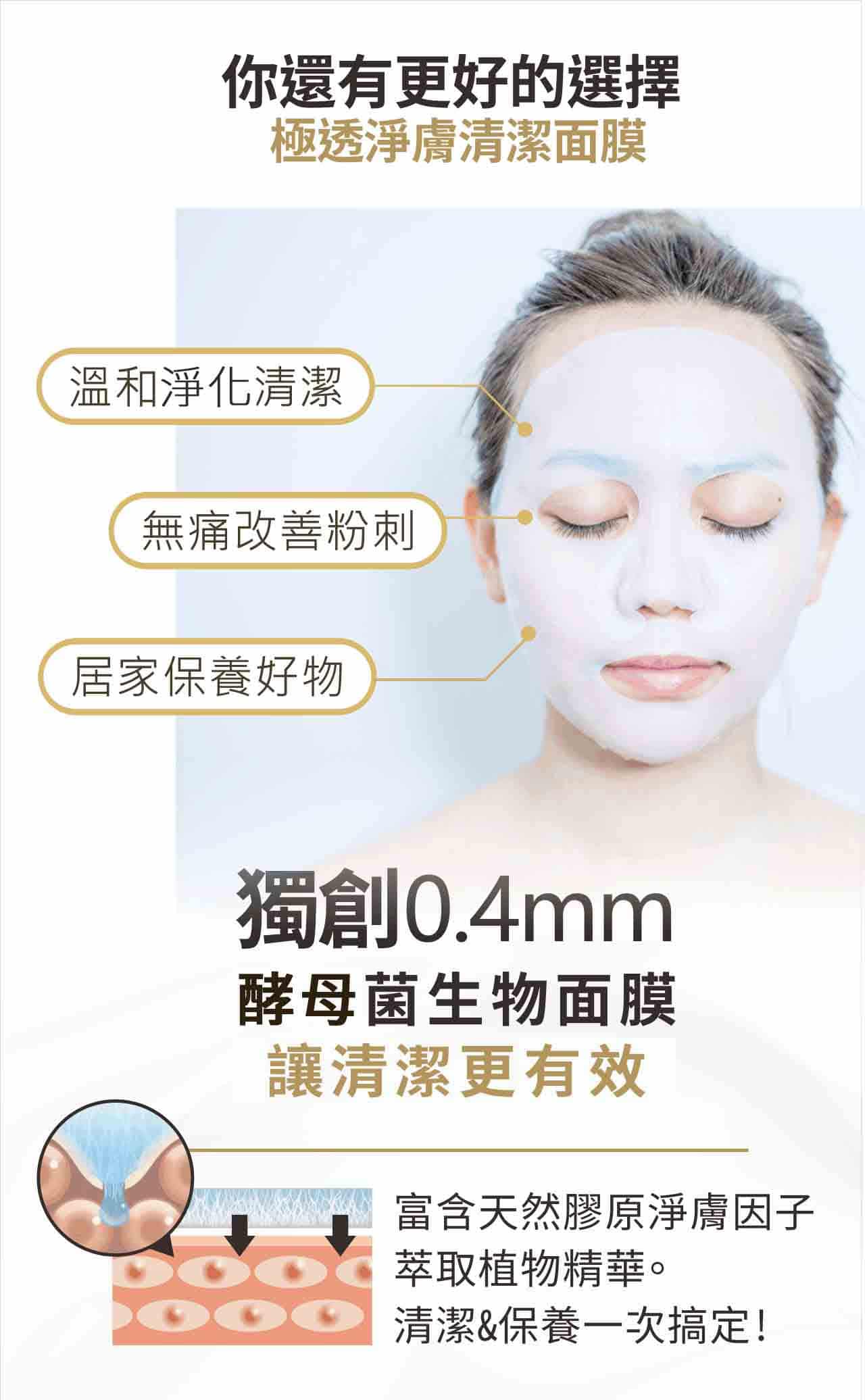 - 天然菌種培育,生物纖維面膜,超強的貼膚性,可深入皮溝與肌膚緊密貼合