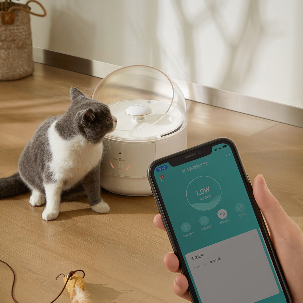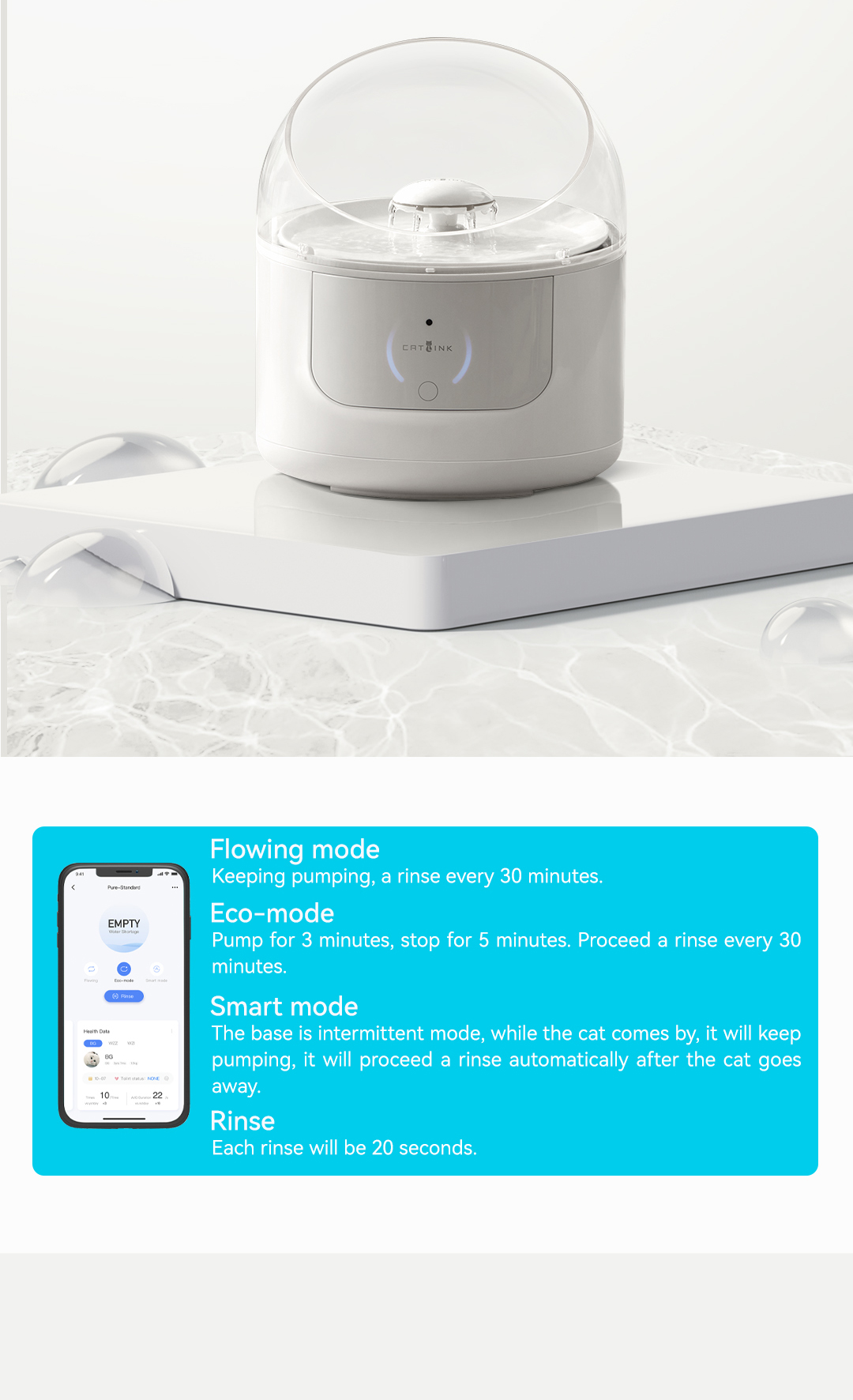 - APP 遠端控制可切換 4 大湧泉模式,有持續湧泉模式、間歇湧泉模式、智慧湧泉模式、還有沖浮毛模式,實現飲水自由式,類比多種湧泉狀態,它是活泉湧動機,秒變貼身水管家,滿足不同場景需求