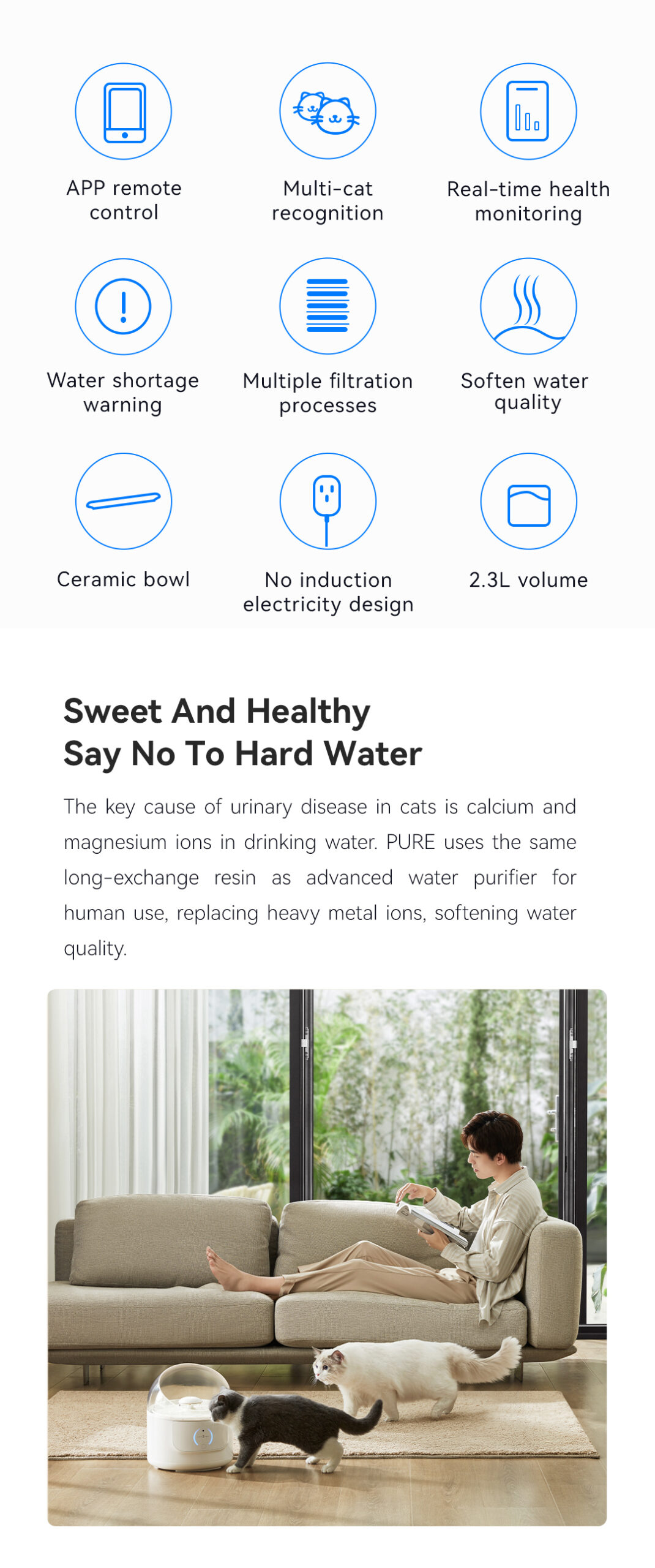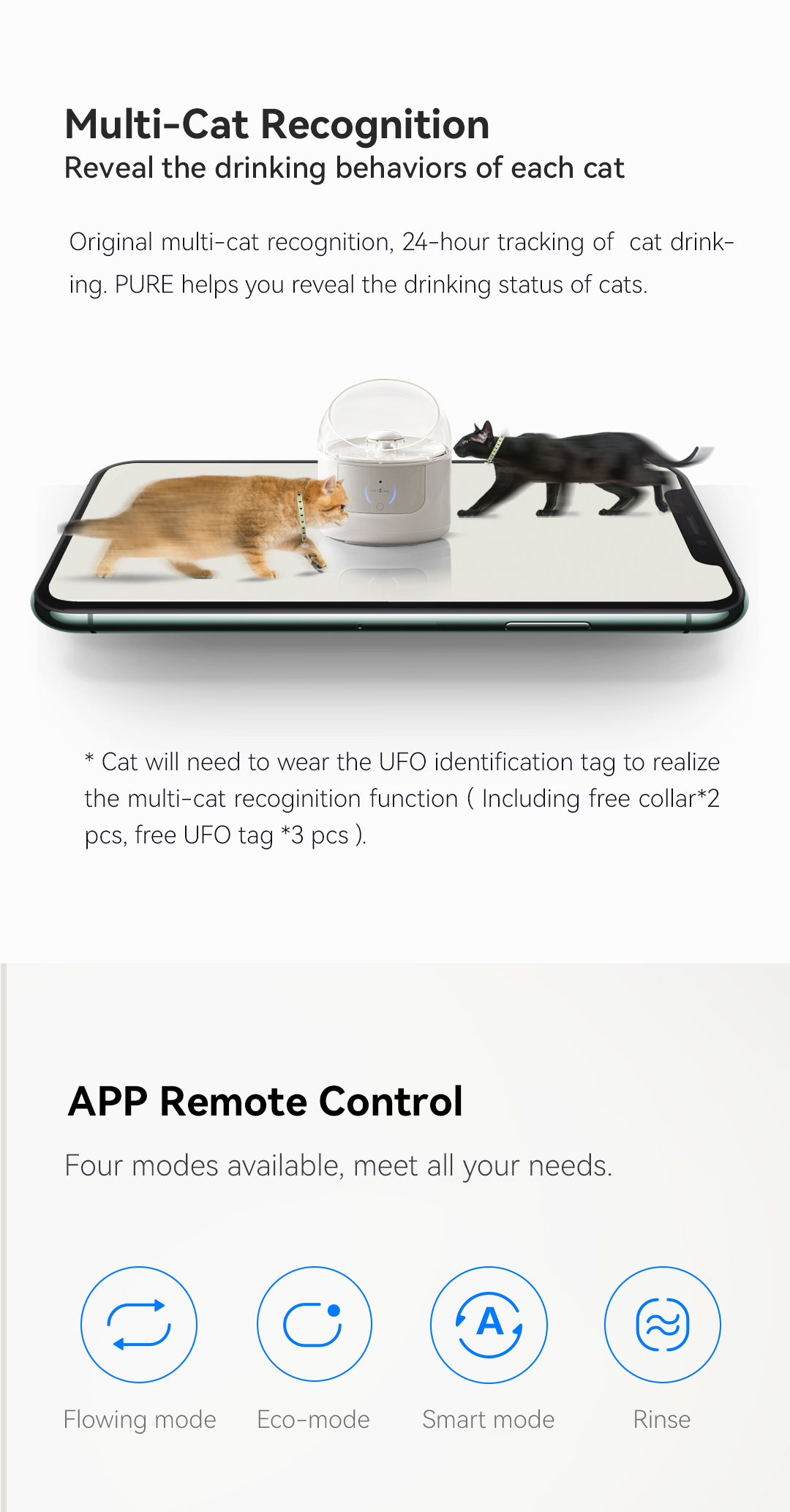 - 多貓智慧識別,探秘貓咪真實飲水欲,獨創多貓識別技術,24H 追蹤貓咪飲水動態,你不曾掌握的貓咪真實飲水欲,讓 PURE 幫你輕鬆揭秘