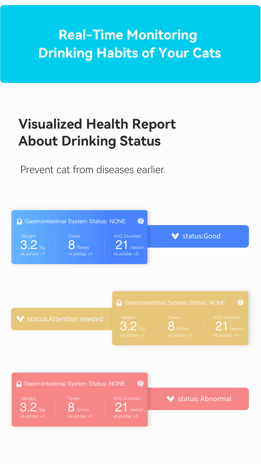 - 健康視覺化,讓資料洞察一目了然,定製版健康報告,全天候採集貓咪飲水資料,智慧分析貓咪健康狀態,更早預防毛孩子泌尿疾病
