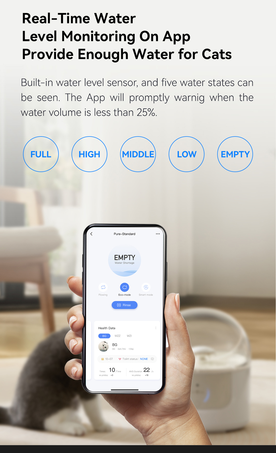 - 水量提醒,貓咪缺水不存在的,內置有水位感測器,五種水量狀態可查,如水位滿、水位高、水位中、水位低、水位空五種狀態,當水量不足 25% 時 APP 及時提醒,保證渴不到貓咪