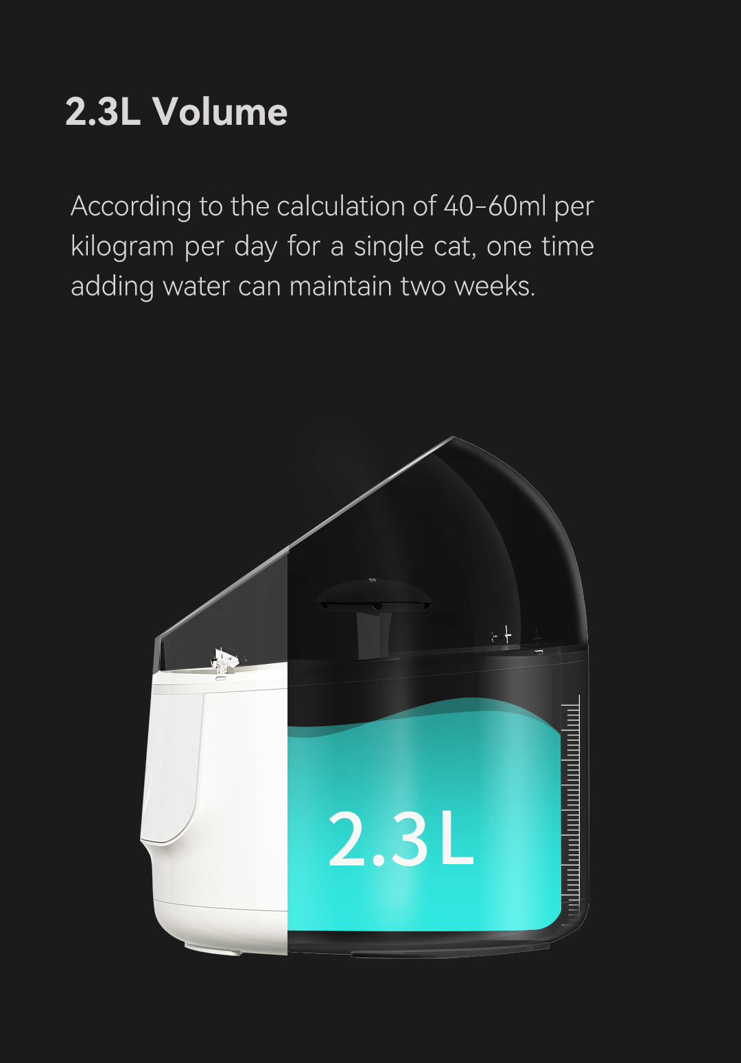 - 2.3L 黃金水量,開懷暢飲,半月無憂,一般按單貓每天每公斤 40 – 60ml 計算,一次加水可維持兩周續航