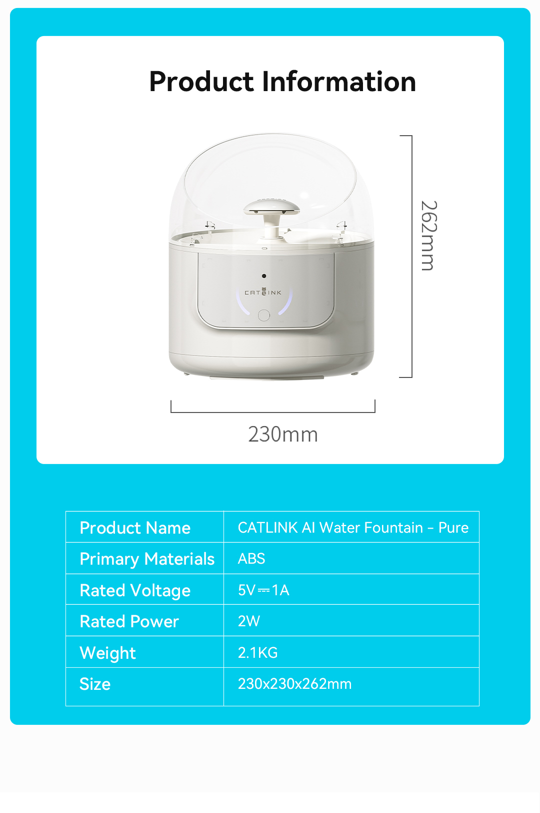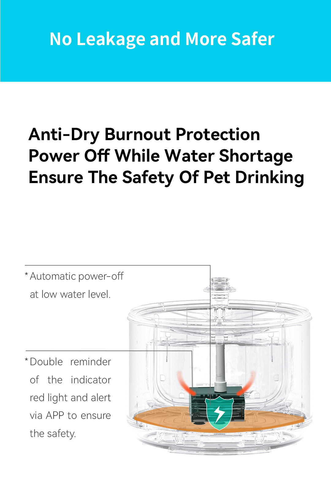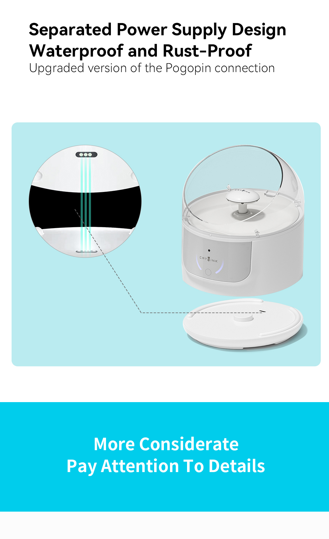 - 無感應電,死守底線,絕不漏電,過壓、過熱、超載、短路保護、輸入輸出電流保護、寬電壓輸入保護、輸出波紋小防乾燒斷電保護、低水位會自動斷電、保障寵物的飲水安全、分離式供電設計、升級版 POGOPIN 介面、防水防生銹,人寵使用更放心