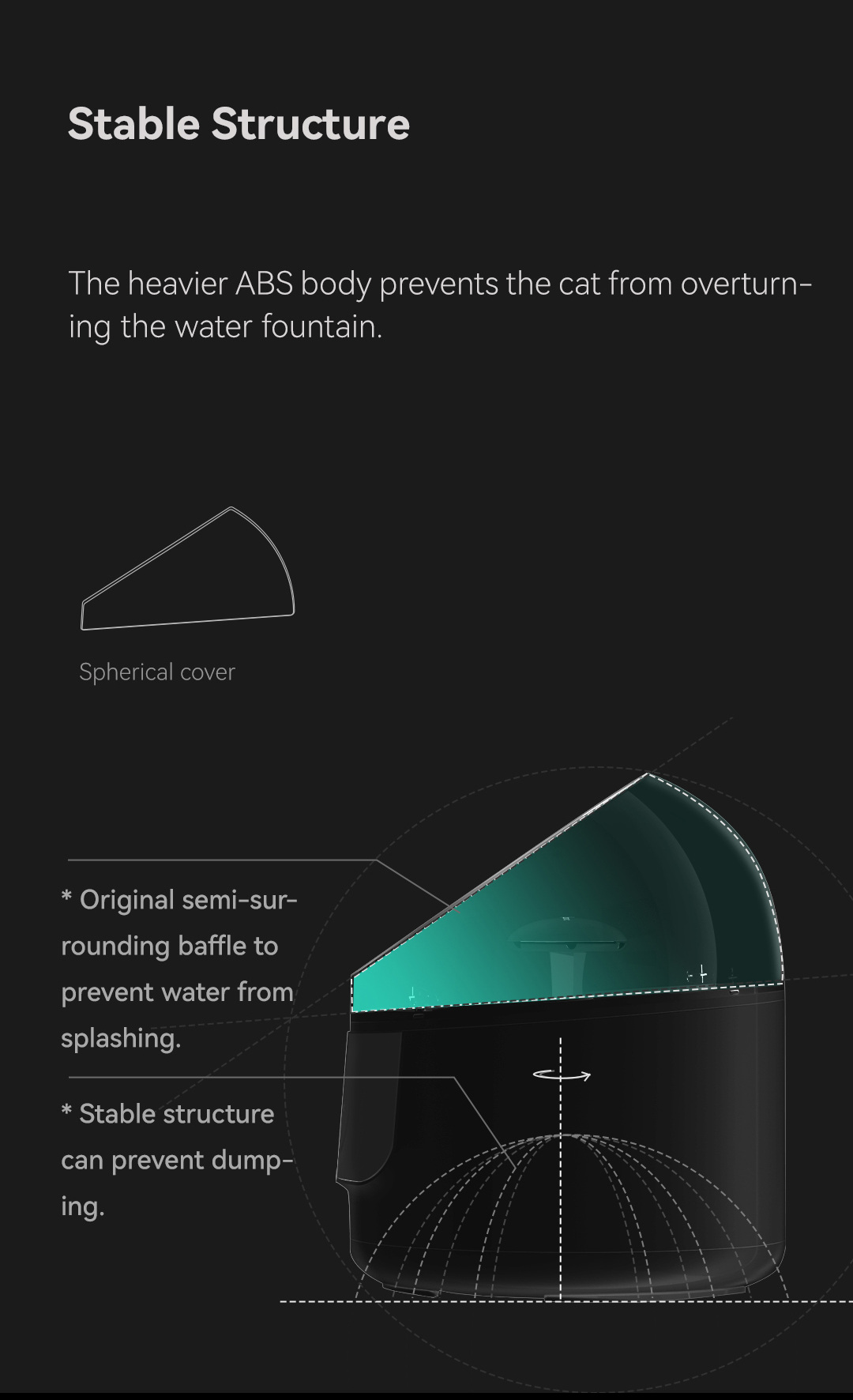 - 結構穩定不易翻,穩穩地很安心,加重版 ABS 材質機身防止貓咪由於好奇打翻飲水機,獨創半圍式擋板,水花不外濺,貓咪不掀蓋