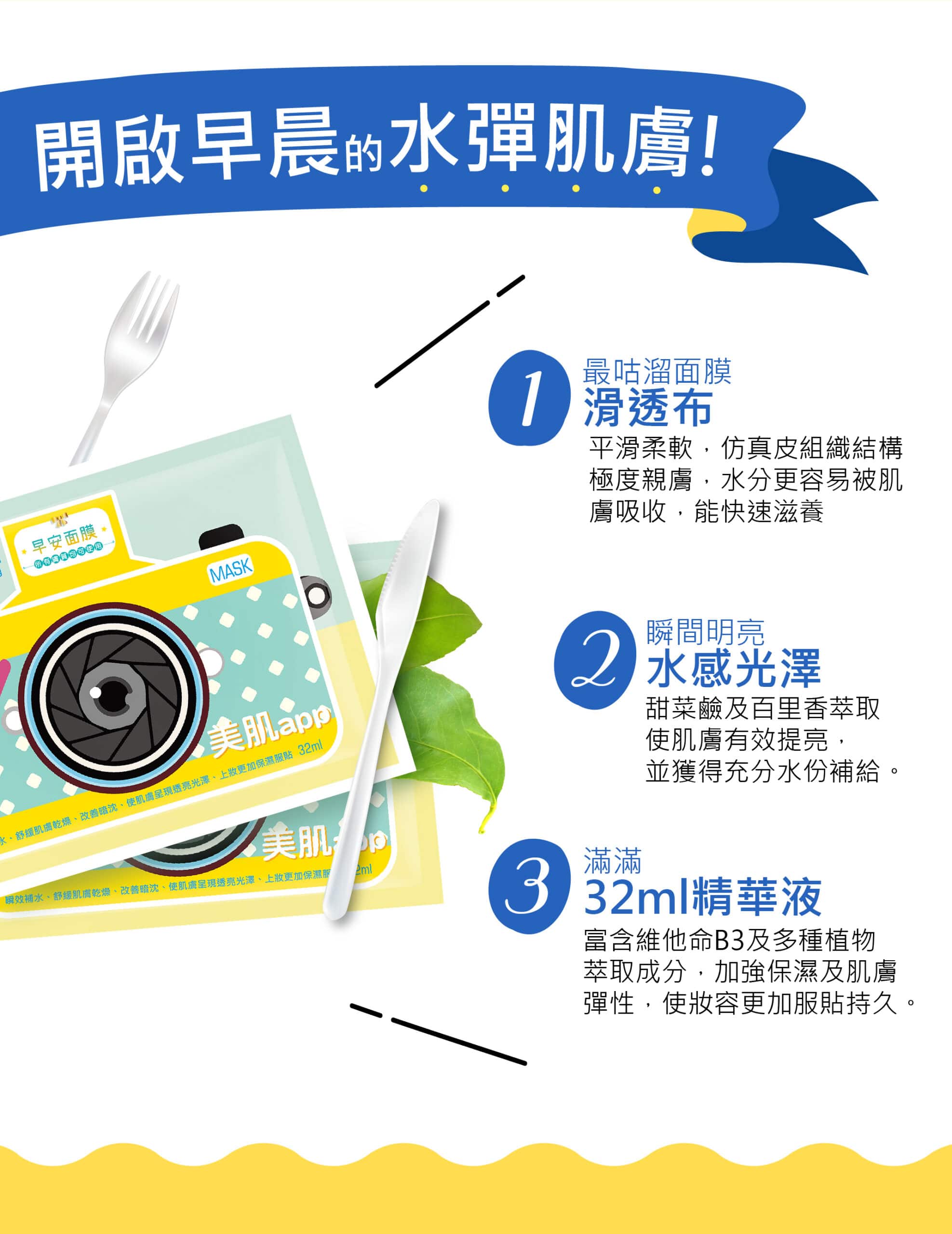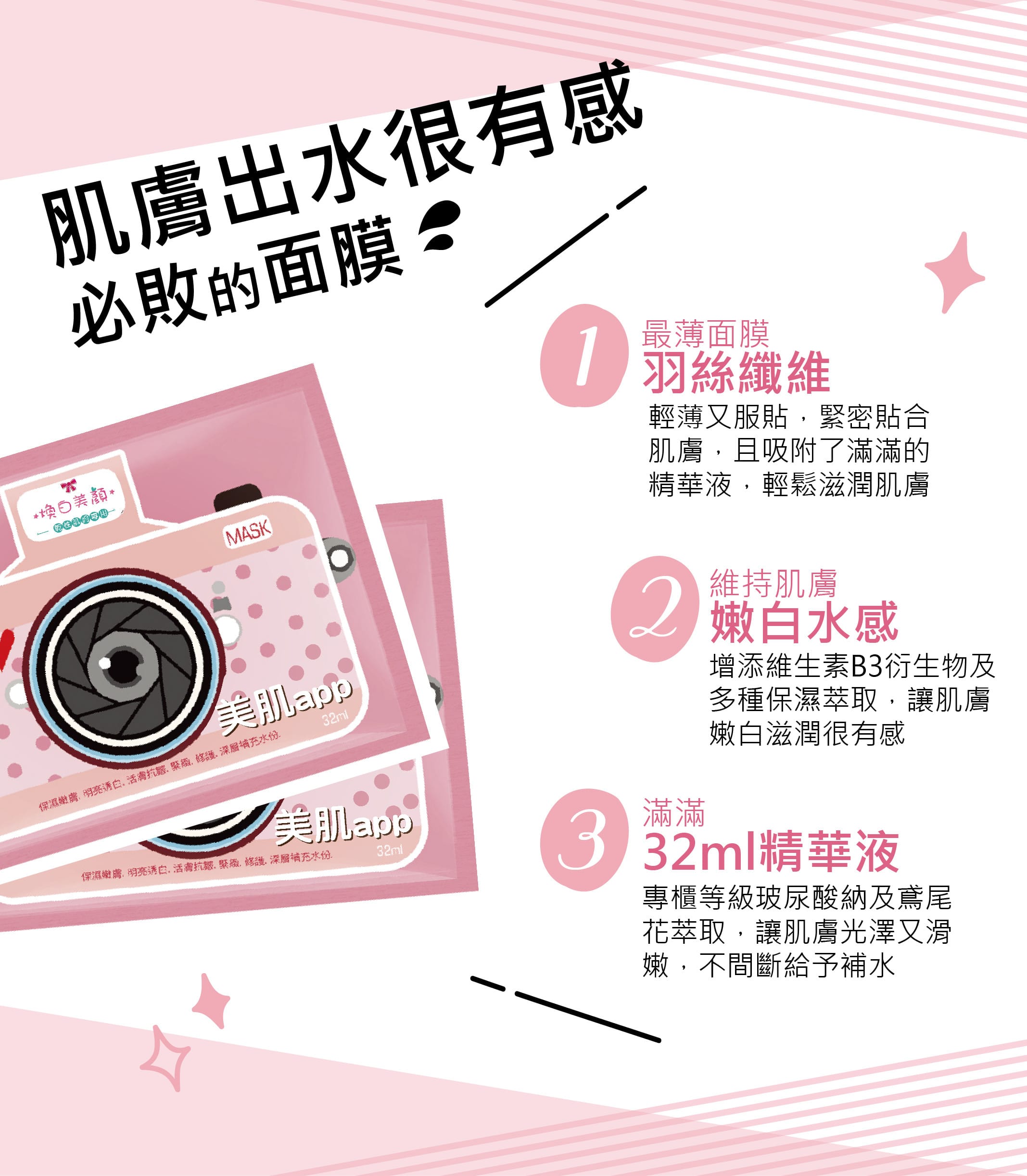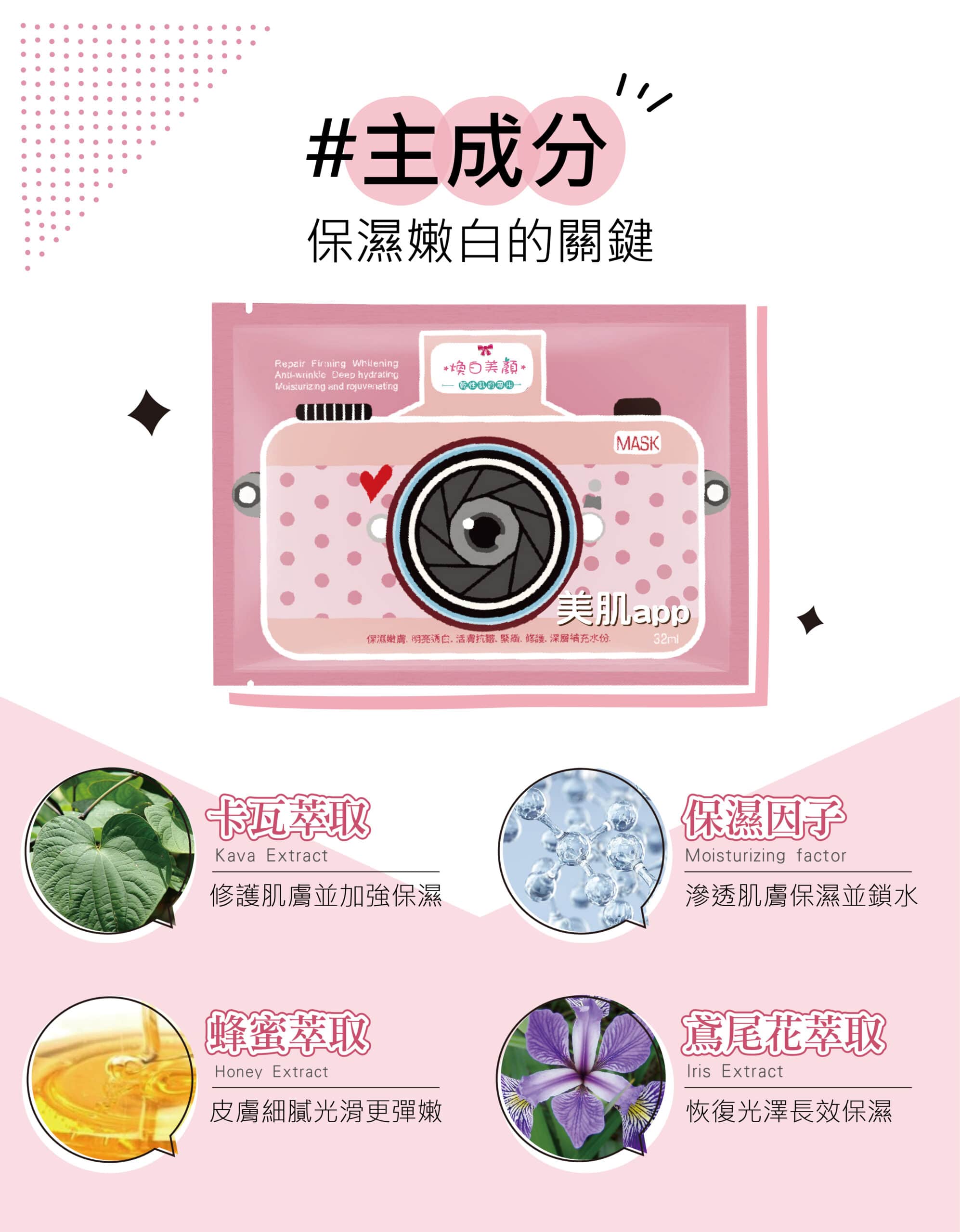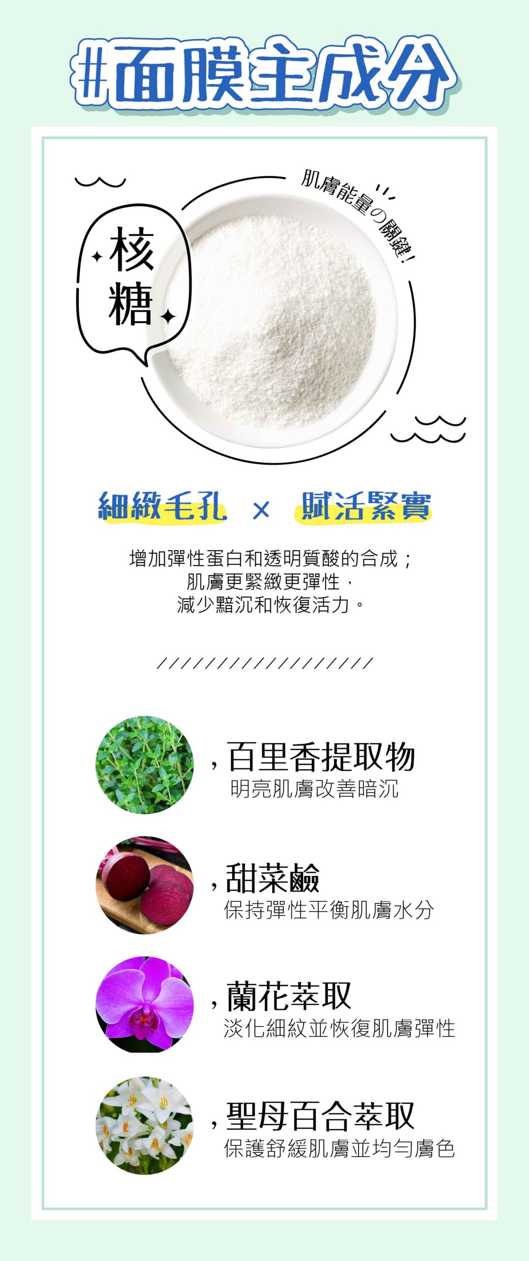 - 用途:含有多種天然植物萃取保濕因子,可以淡化細紋、舒緩肌膚乾燥、形成保護膜並且恢復肌膚水嫩感、舒緩疲倦不適的肌膚幫助維持肌膚健康,讓妝感更加保濕服貼、呈現透亮光澤,敷完面膜就可以美美上妝立即出門