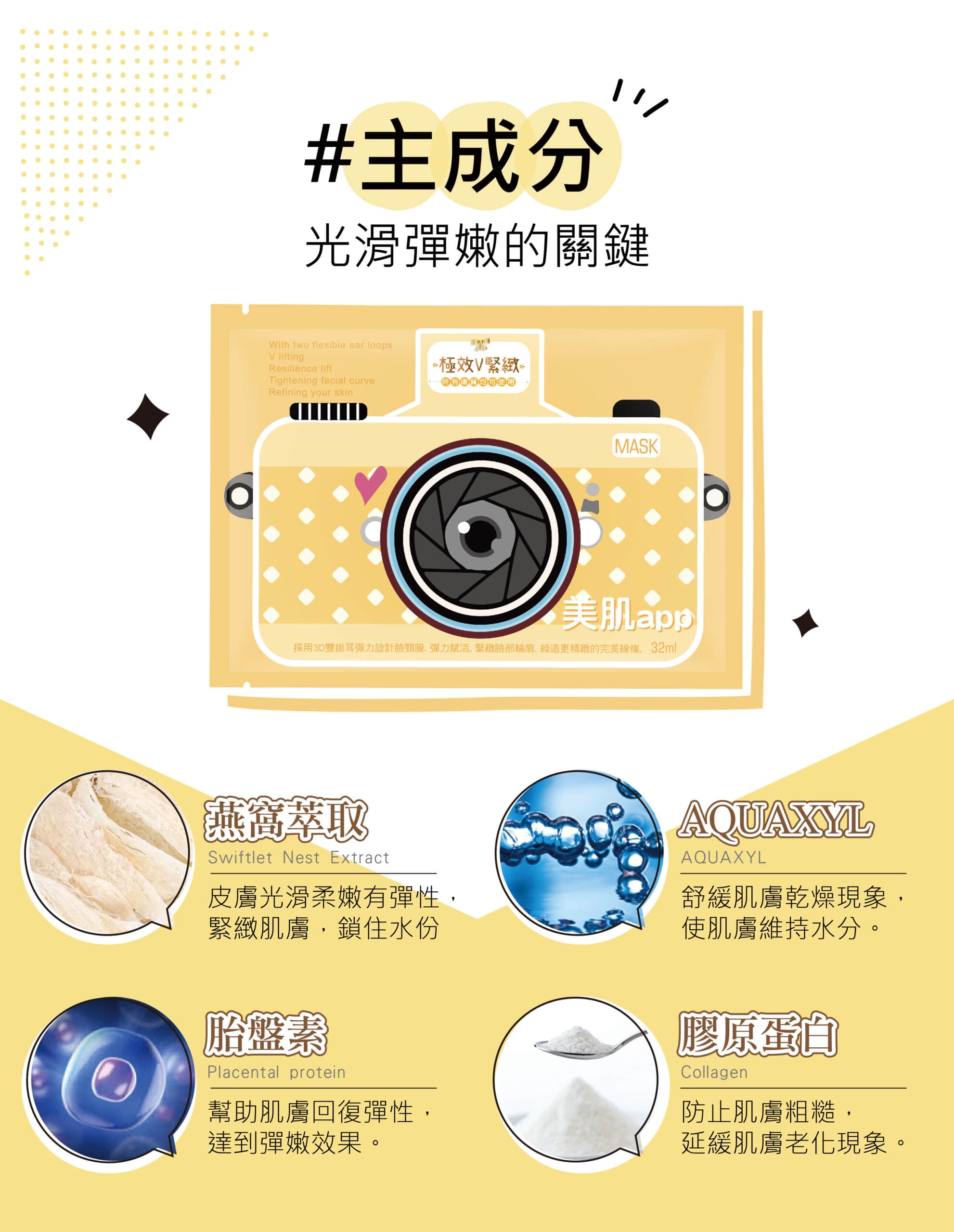 - 主成分:玻尿酸鈉、維生素 B3 衍生物 (菸鹼醯酸)、傳明酸、膠原蛋白、胎盤素、燕窩萃取、聚麩胺酸、海藻玻尿酸、AQUAXYL (木糖醇葡萄糖苷 / 脫水木糖醇 / 木糖醇)