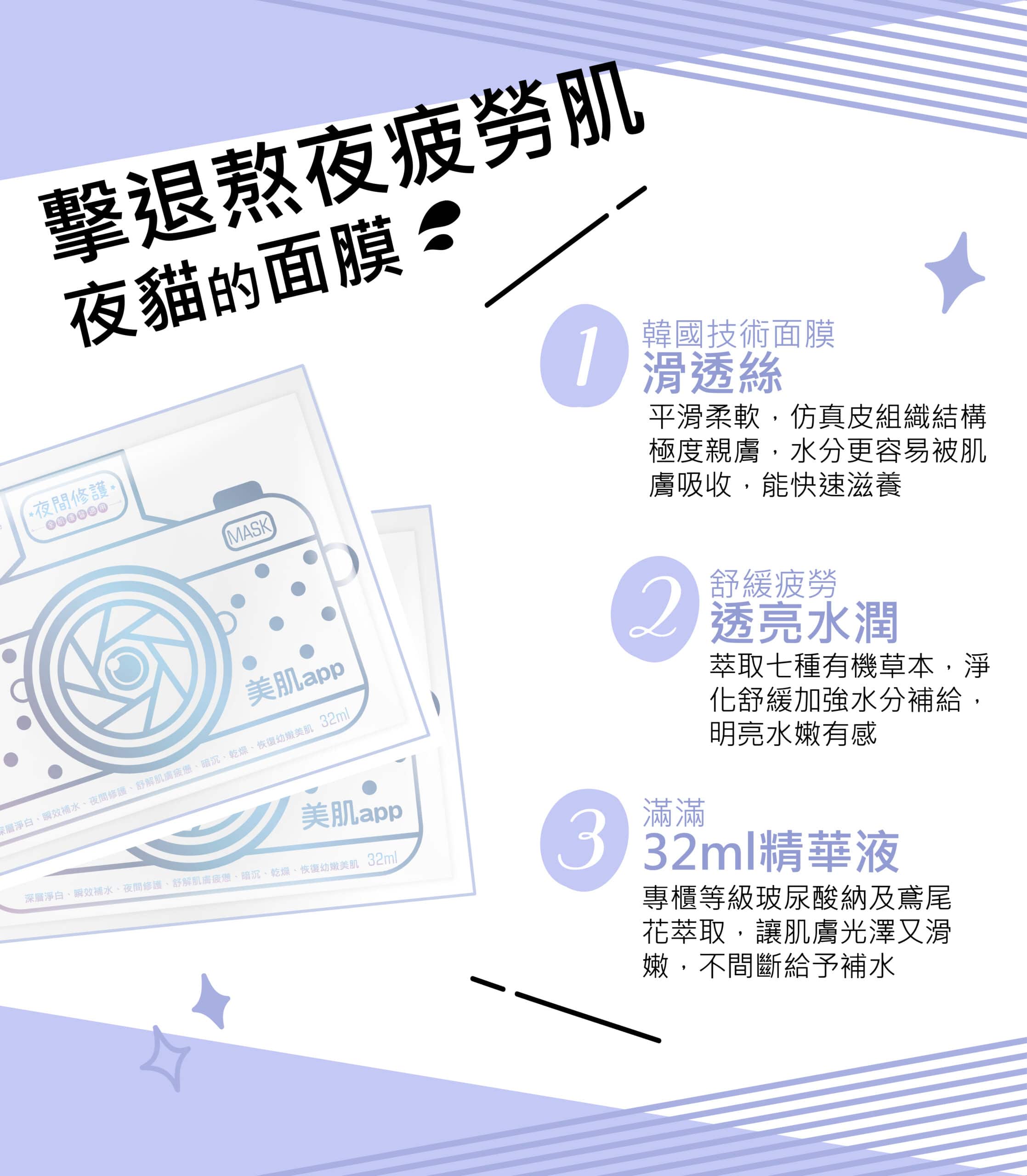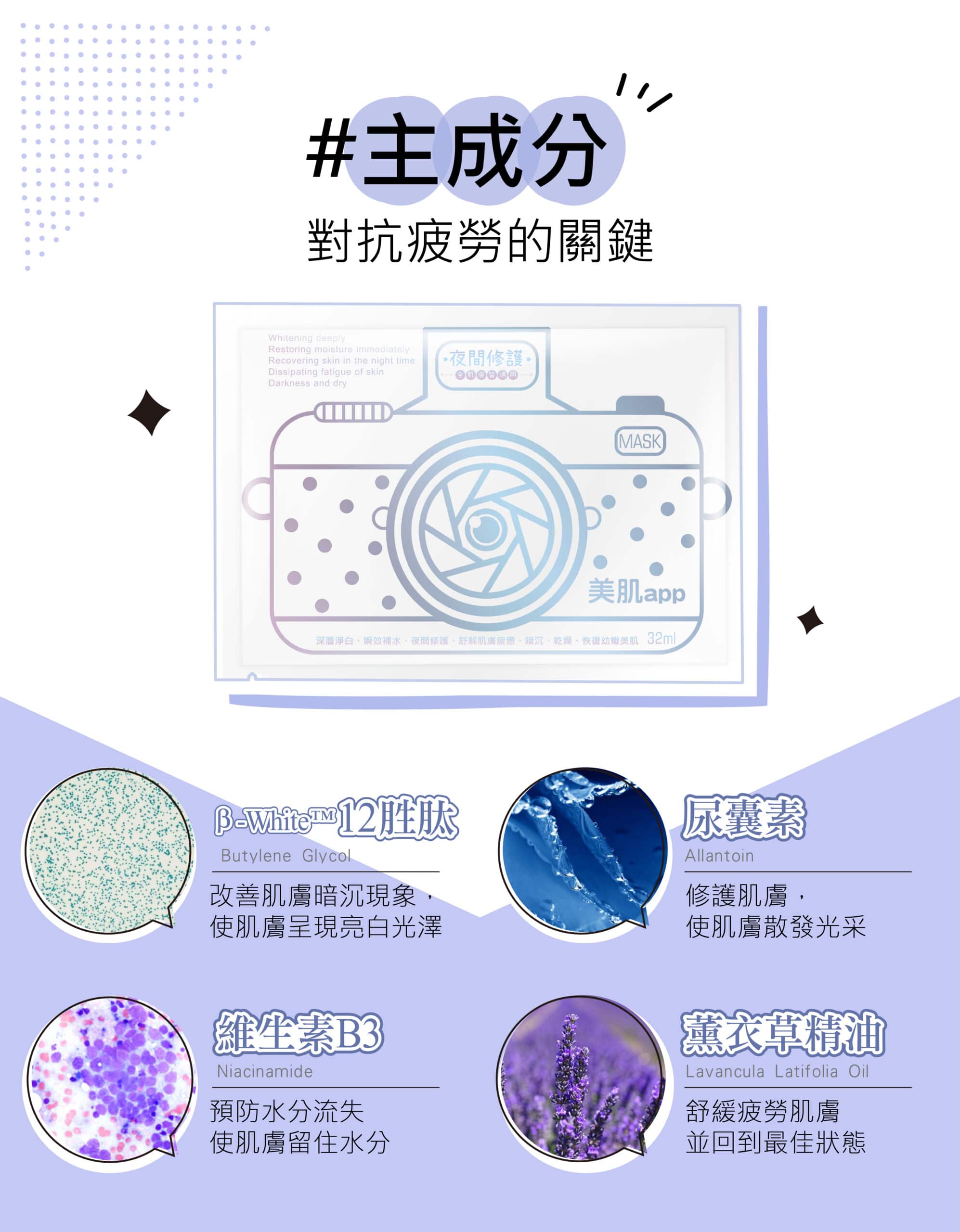- 用途:能有效幫助肌膚留住水分,提升熬夜後乾燥肌膚水分補給,加強肌膚水感,恢復臉部彈性保澤度,並減緩暗沉,調理熬夜帶來的肌膚暗沉,使膚質重返透亮光采,由內而外恢復光澤美麗