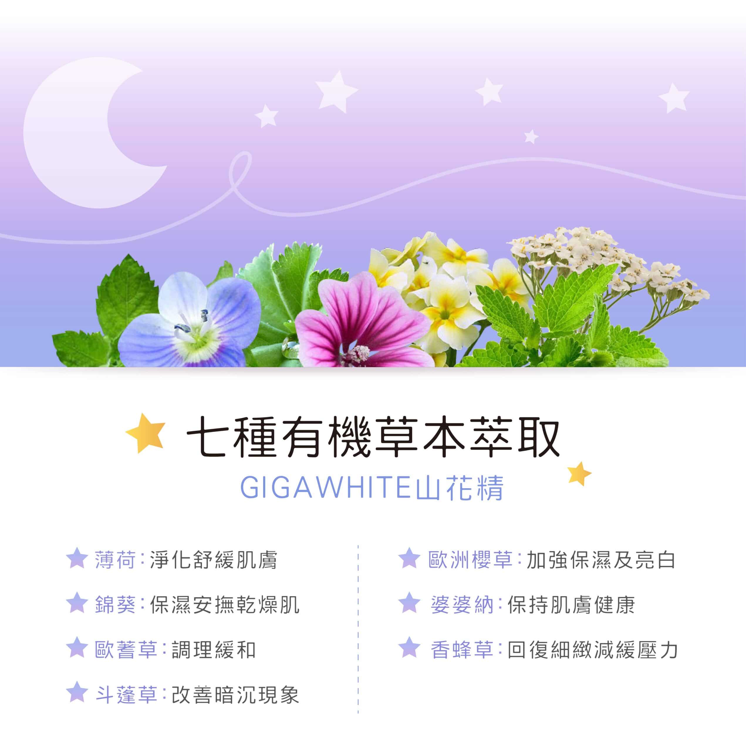 - 主成分:尿囊素、維生素 B3 衍生物 (菸酸鹼)、傳明酸、異構寡糖、GIGAWHITE 山花精 (七種植物萃取)、β-White™ 12胜肽、乳木果油、海藻玻尿酸、薰衣草精油