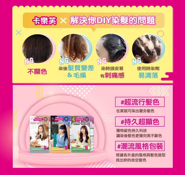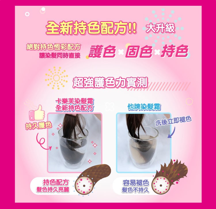 - 卡樂芙讓每個女孩展現屬於自我的色彩,全系列產品融合叛逆甜美與超顯色玩髮,從染髮品到洗護品項,透過貼心的包裝與工具設計,讓每個女孩在「顯色、鎖色、護色」的玩髮過程中,處處找到驚喜,玩髮也成為一種享樂,改變也如此輕鬆 Easy