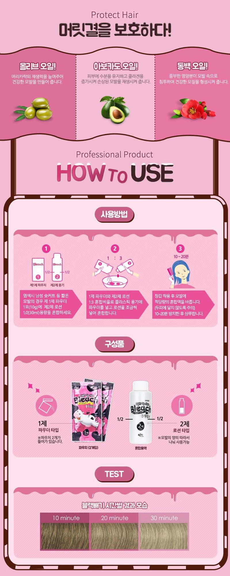 - 幫助染出顯色度超高的髮色,漂髮後頭髮主要變淺金色,之後再用染髮產品會更出色