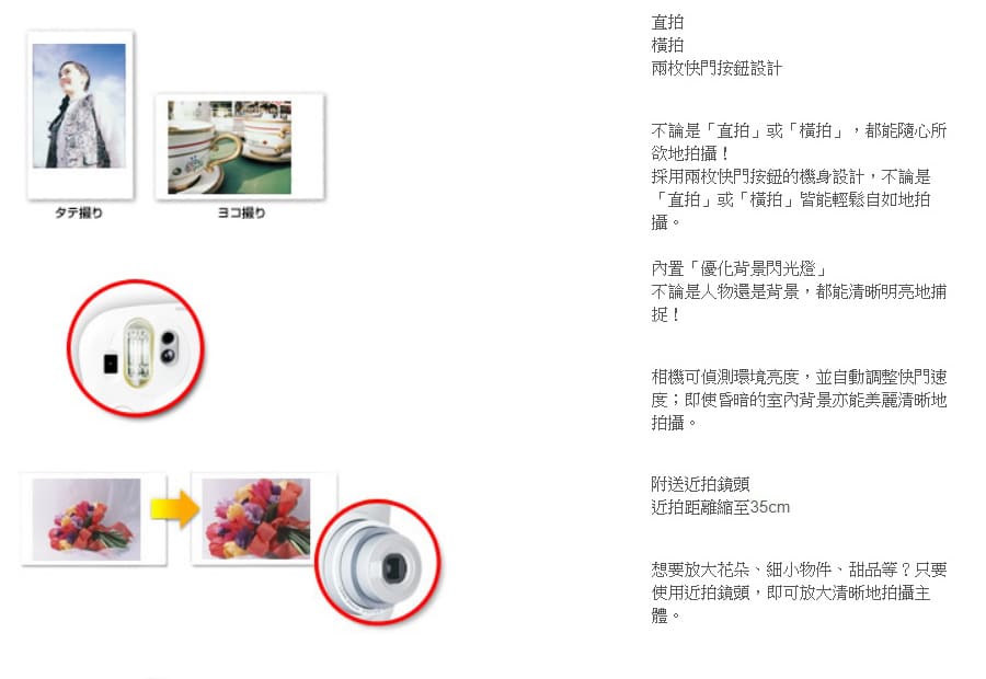 - 其他:菲林確認窗、可加裝簡易近拍鏡頭 (拍攝距離:35cm~50cm)