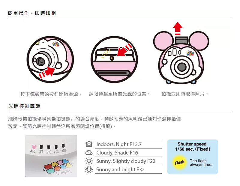 - 產品配件:近拍鏡、DISNEY TSUM TSUM 背帶、2 枚 2A 鹼性電池