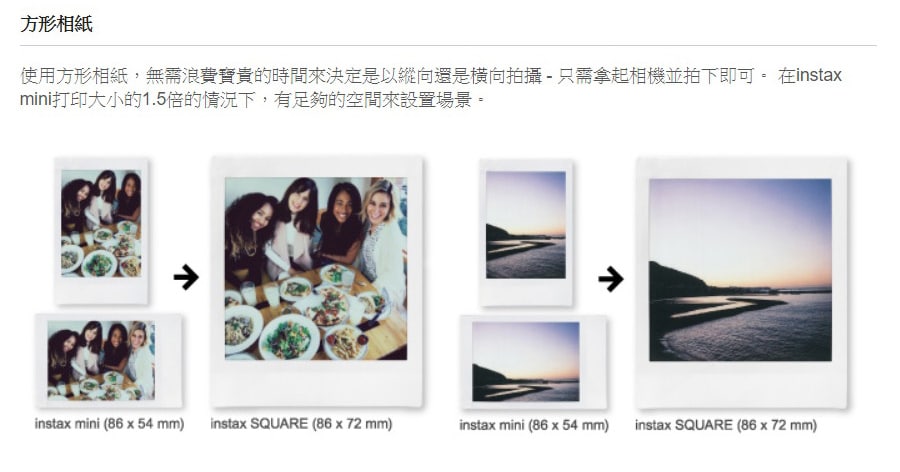 • instax SQUARE 方形相紙是 instax mini 相紙大小的 1.5 倍