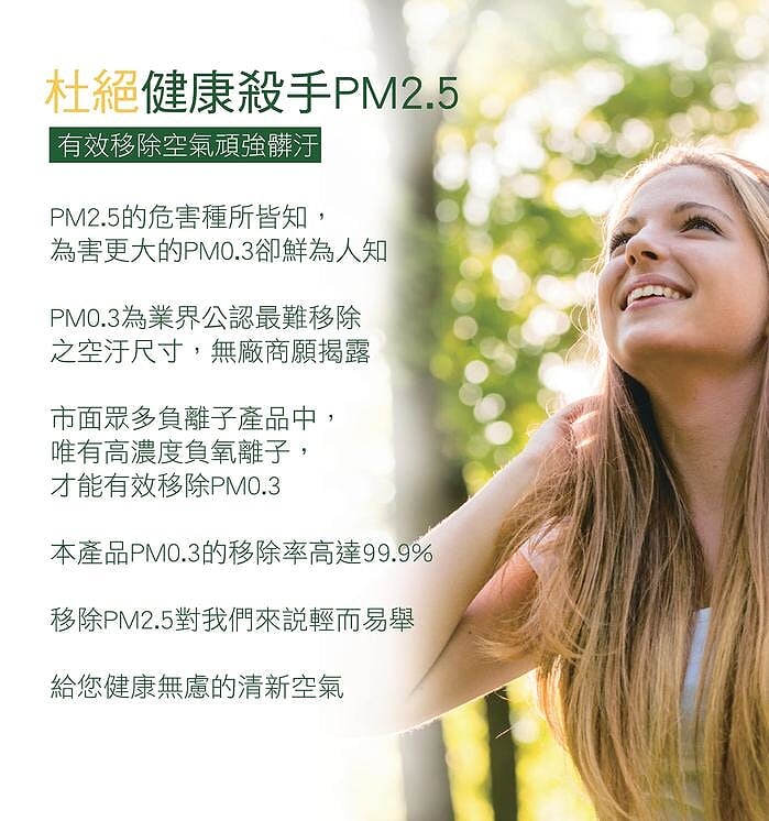 不只 PM 2.5,業界公認更難移除的 PM 0.3 一樣有效移除,高濃度負離子移除率達 99%