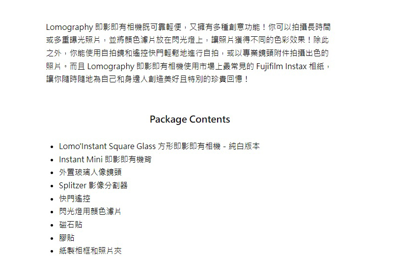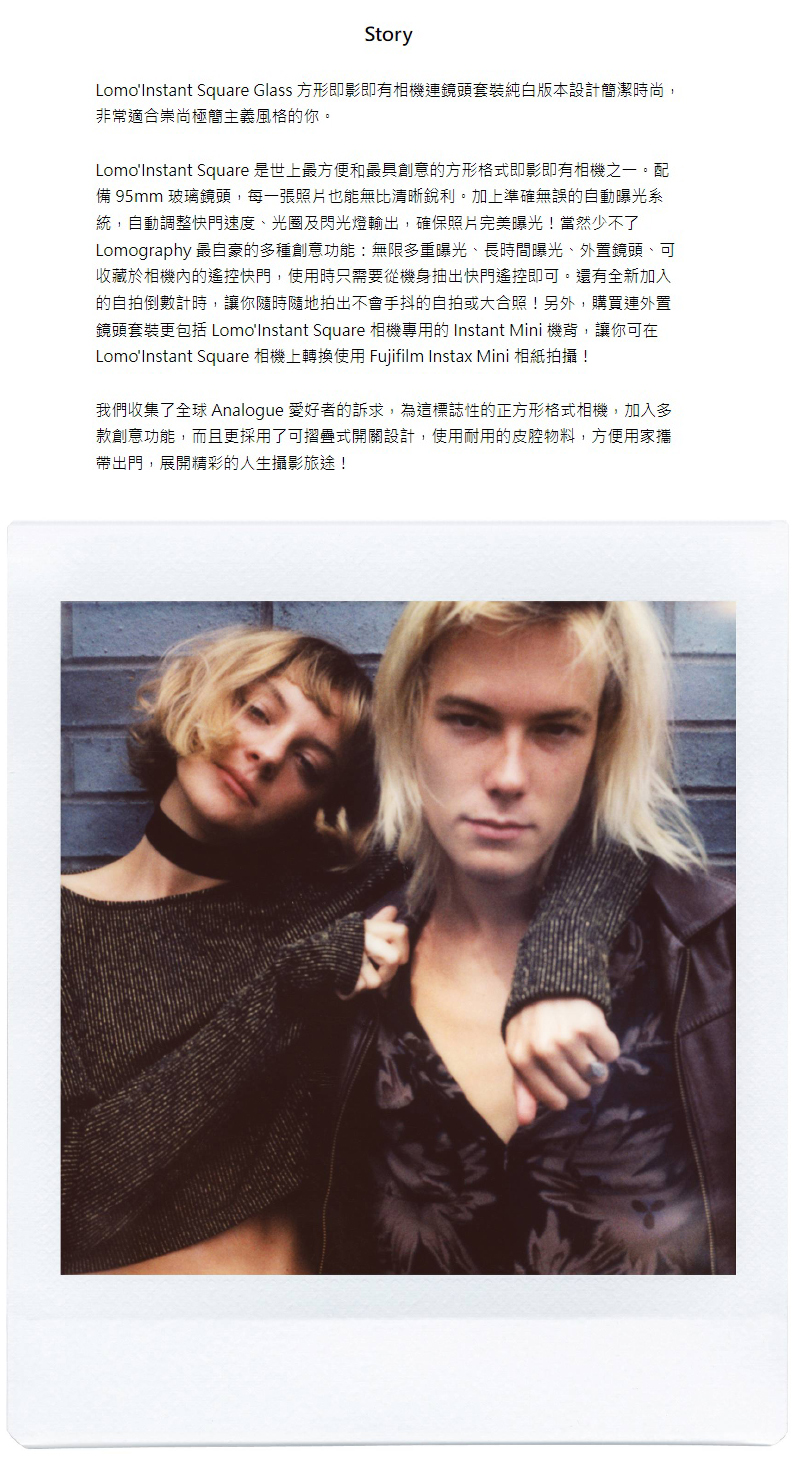 - 使用全球首部兼容 INSTAX SQUARE 及 INSTAX MINI 相紙、備有玻璃鏡頭及摺疊式設計的即影即有相機,拍攝極具創意及藝術感的照片!擁有多種配件,讓你的方形即影即有體驗升級!