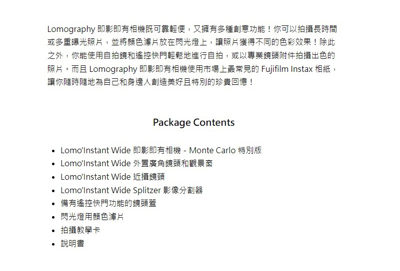 - 以型格時尚的 LOMO’INSTANT WIDE 即影即有相機-MONTE CARLO 特別版拍攝更大的照片尺寸,令即影即有攝影快樂亦加倍放大!