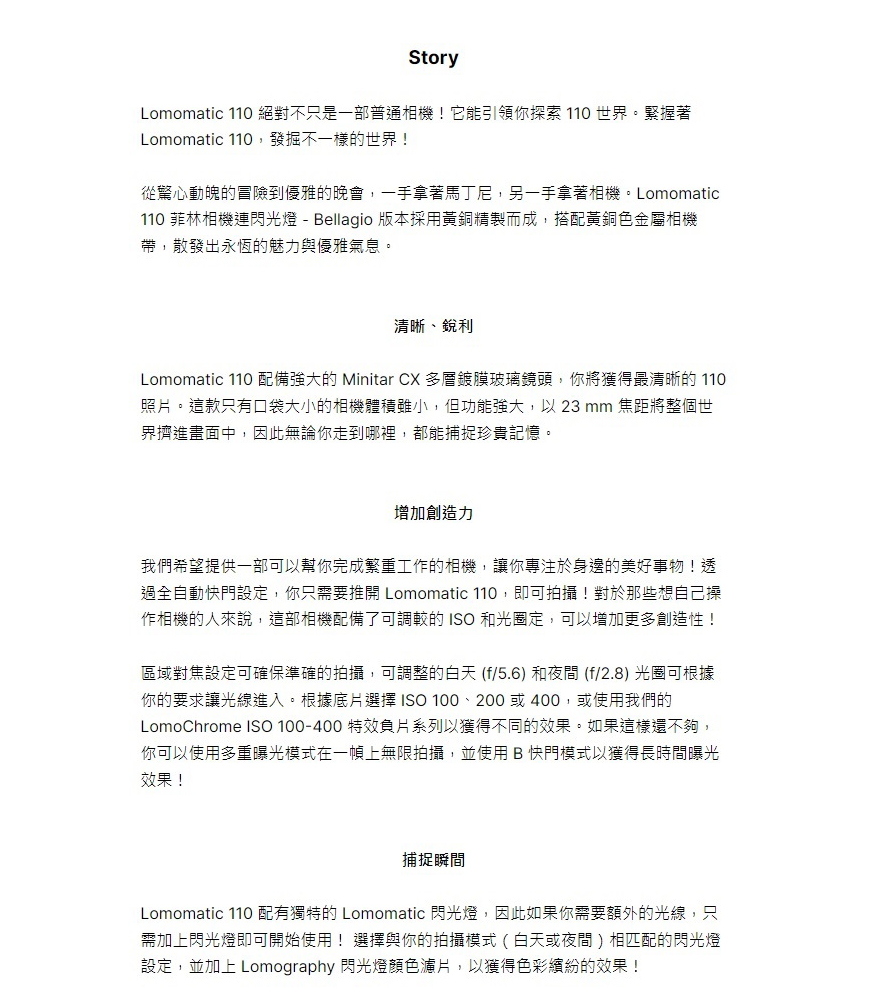 - 準備好使用這款黃銅版 LOMOMATIC 110 相機優雅地捕捉日常生活瞬間。擁有清晰銳利的玻璃鏡頭、自動曝光、有趣的創意功能,以及可拆卸的閃光燈。你的 110 之旅現在開始!