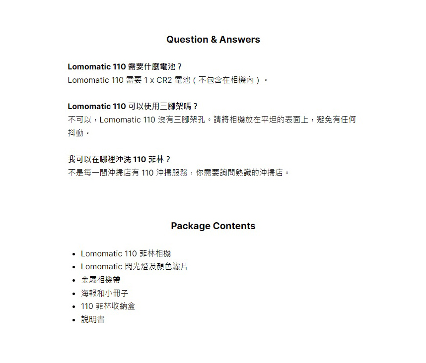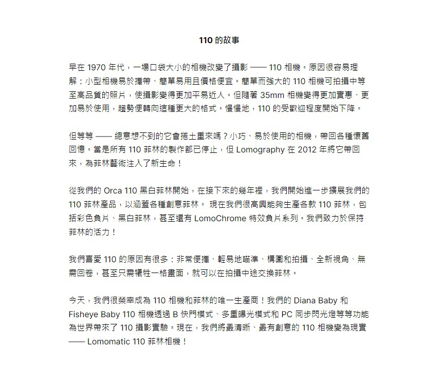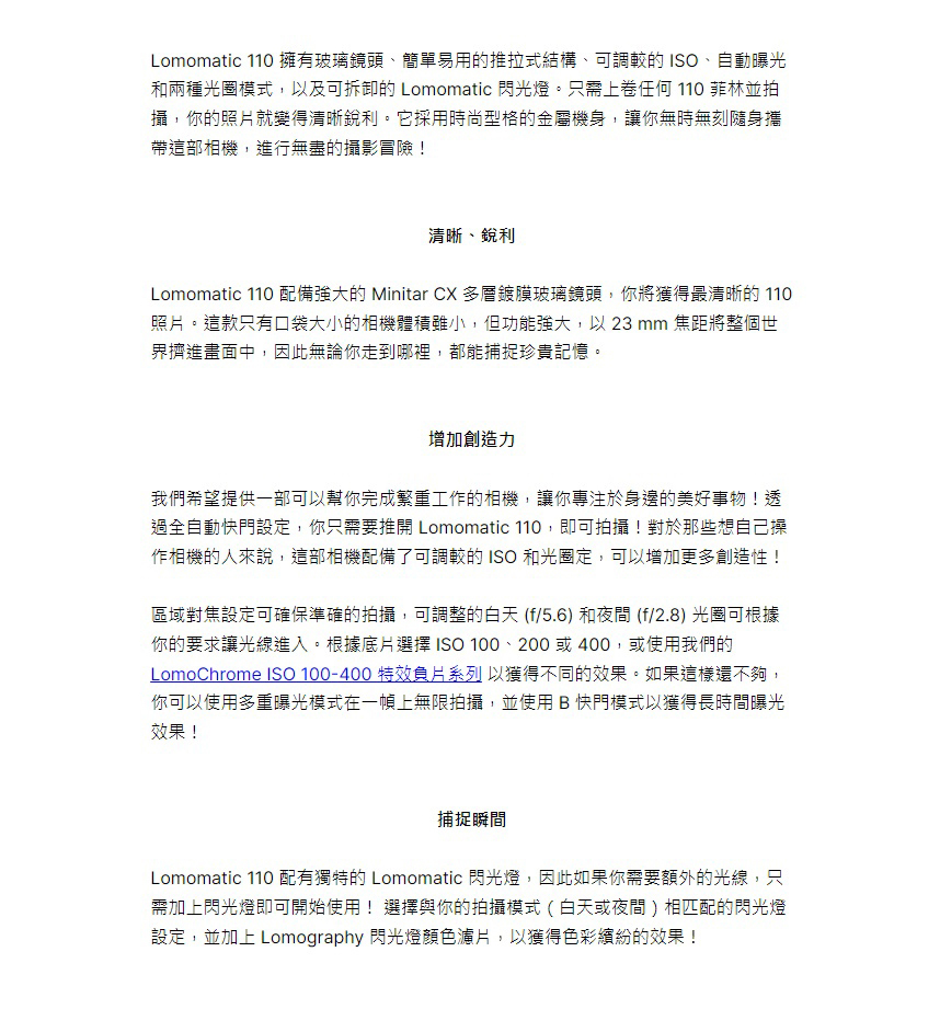- 帶著地球上最清晰、最有創意的 110 菲林相機進行冒險!LOMOMATIC 110 菲林相機擁有時尚型格的金屬機身、清晰銳利的玻璃鏡頭、自動曝光、有趣的創意功能,以及可拆卸的閃光燈。你的 110 之旅現在開始!