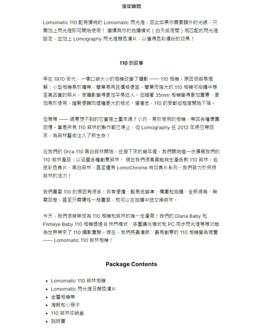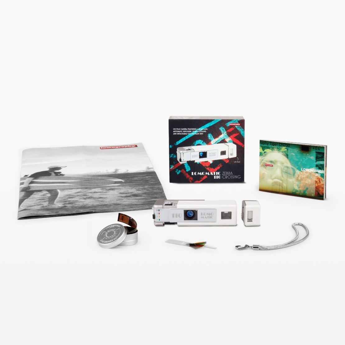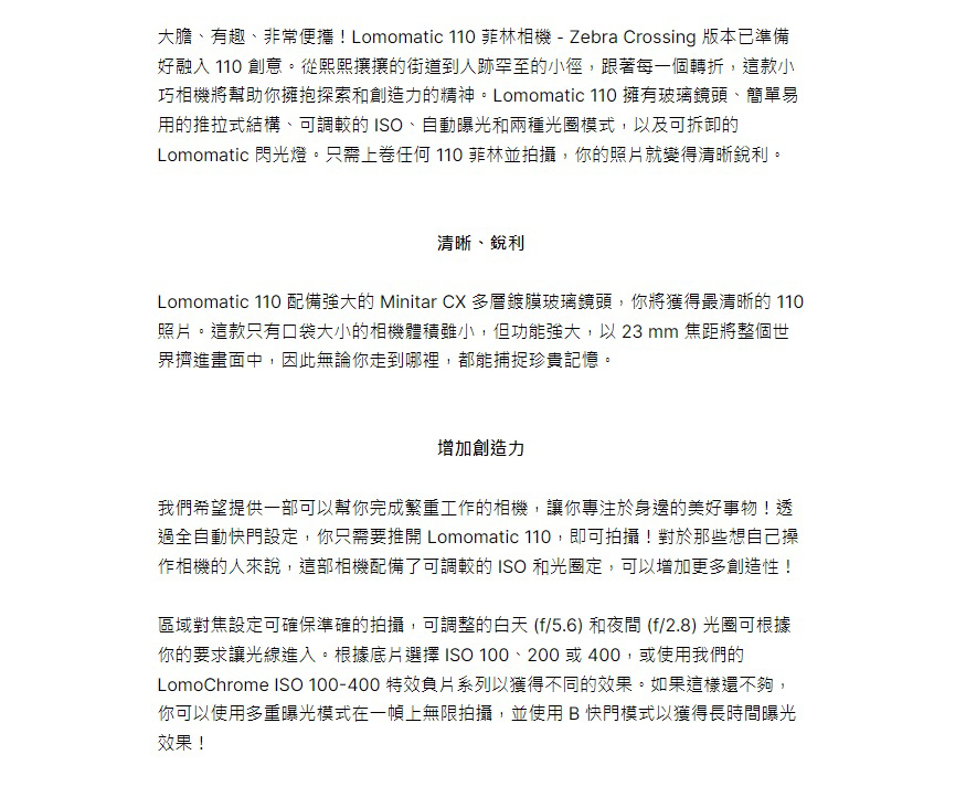 - 帶著地球上最清晰、最有創意的 110 菲林相機進行冒險!LOMOMATIC 110 菲林相機-ZEBRA CROSSING 版本擁有時尚的機身設計、清晰銳利的玻璃鏡頭、自動曝光、有趣的創意功能,以及可拆卸的閃光燈。你的 110 之旅現在開始!