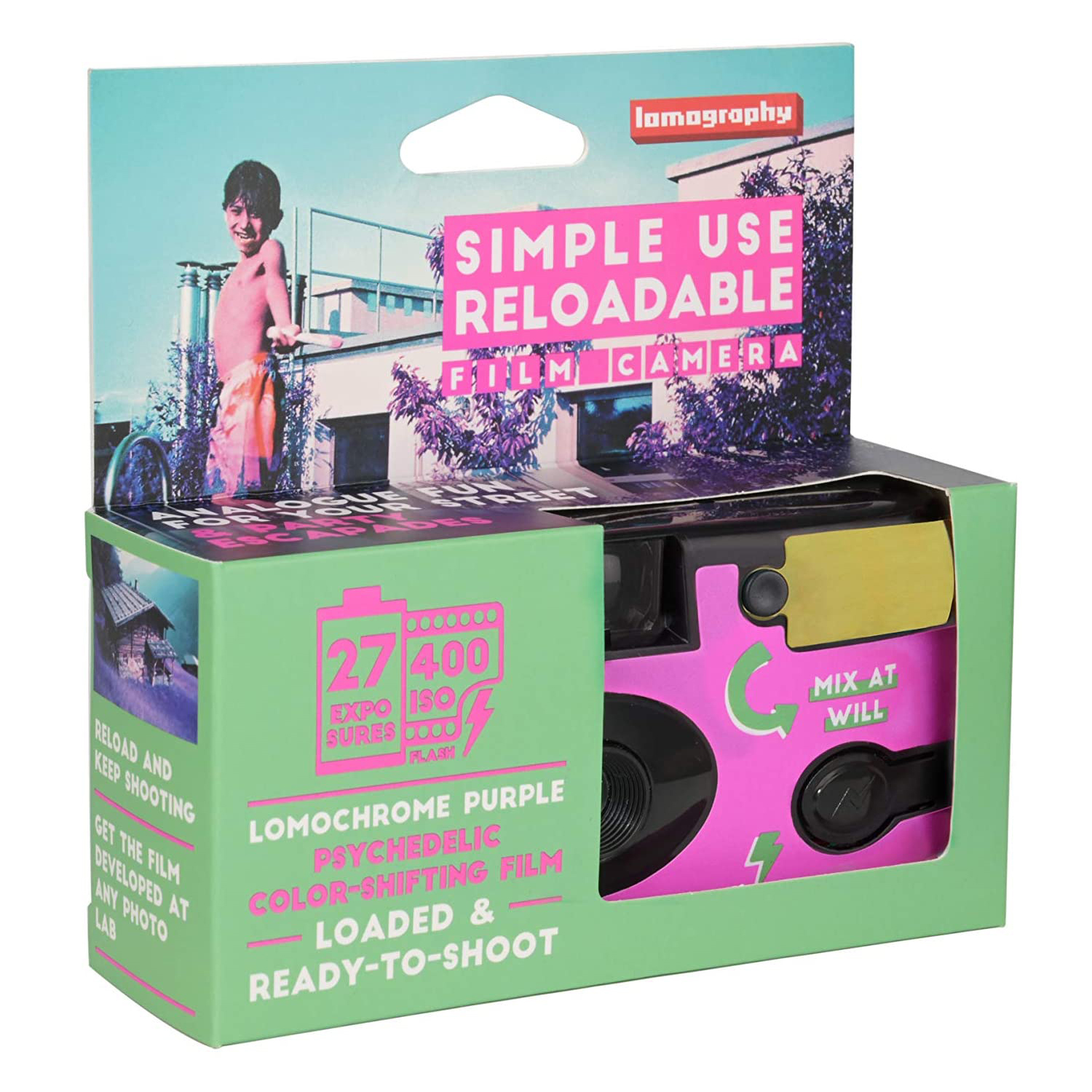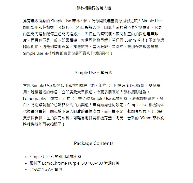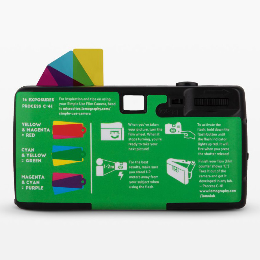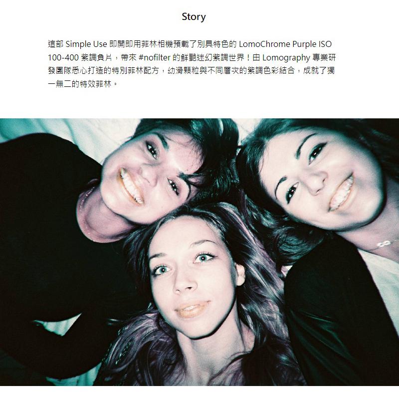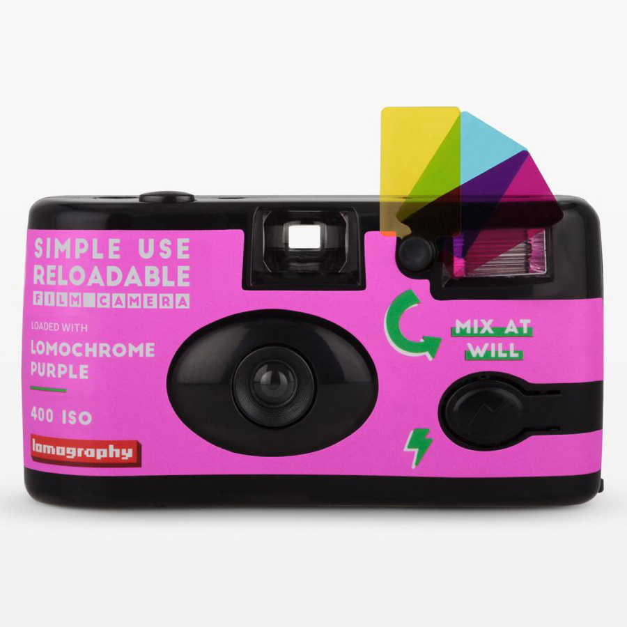 - 這款 SIMPLE USE 即開即用菲林相機預載了 LOMOGRAPHY 別具特色的 LOMOCHROME PURPLE 紫色負片,為成像帶來迷人紫調色彩外,還擁有閃光燈功能、顏色濾片,更可重新上卷重覆使用,是一部性價比和可玩性極高的菲林相機!