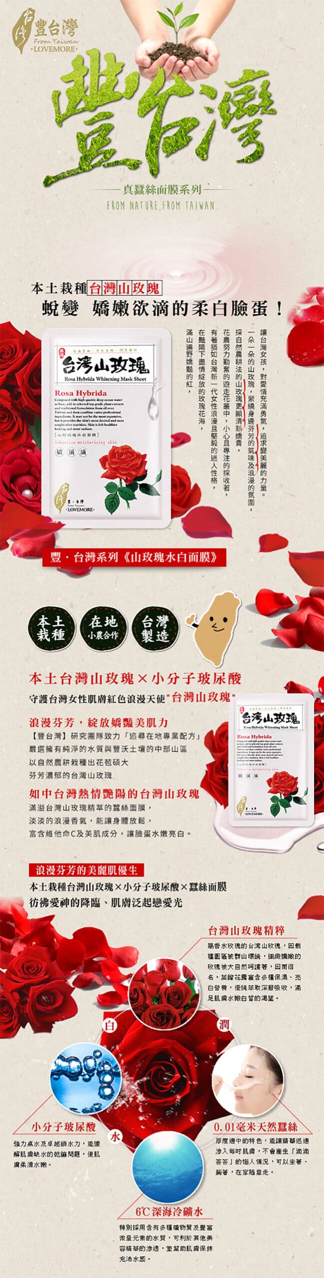 - 台灣山玫瑰純露結合純深海水製成隱形面膜,令肌膚看起來完美
