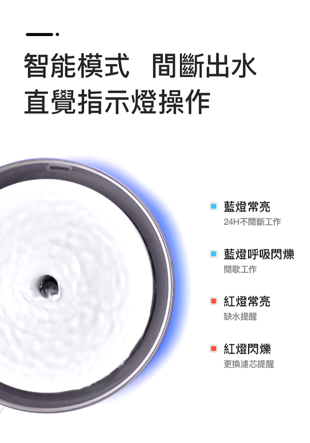- 紅燈常亮代表缺水,紅燈閃爍請更換濾芯並重置設備