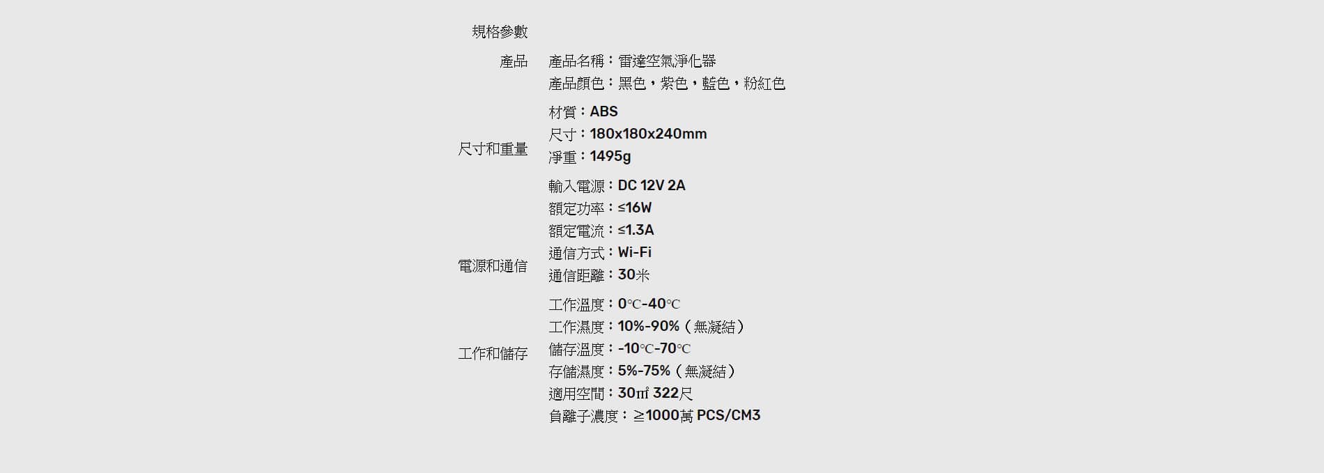 - 負離子濃度:≧ 1000 萬 PCS / CM3