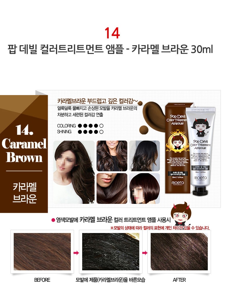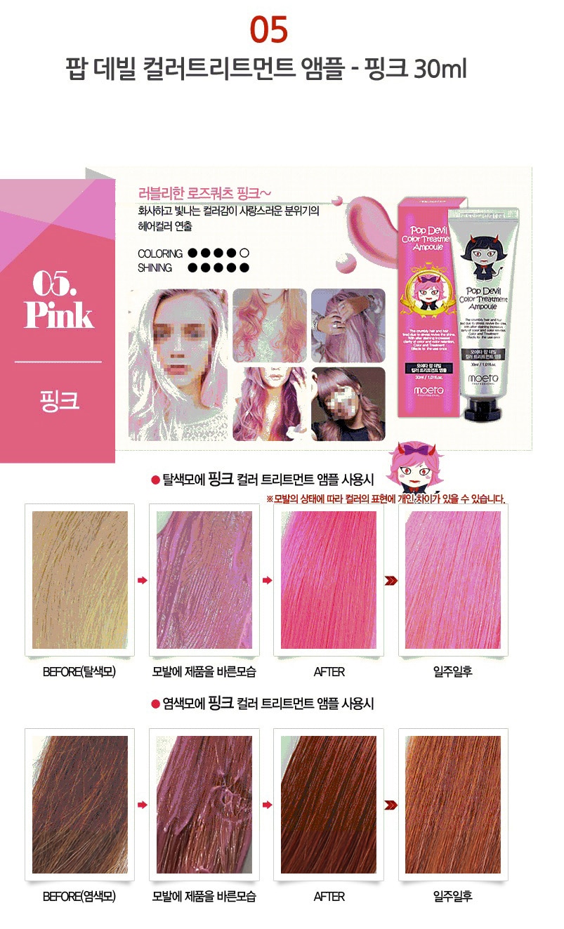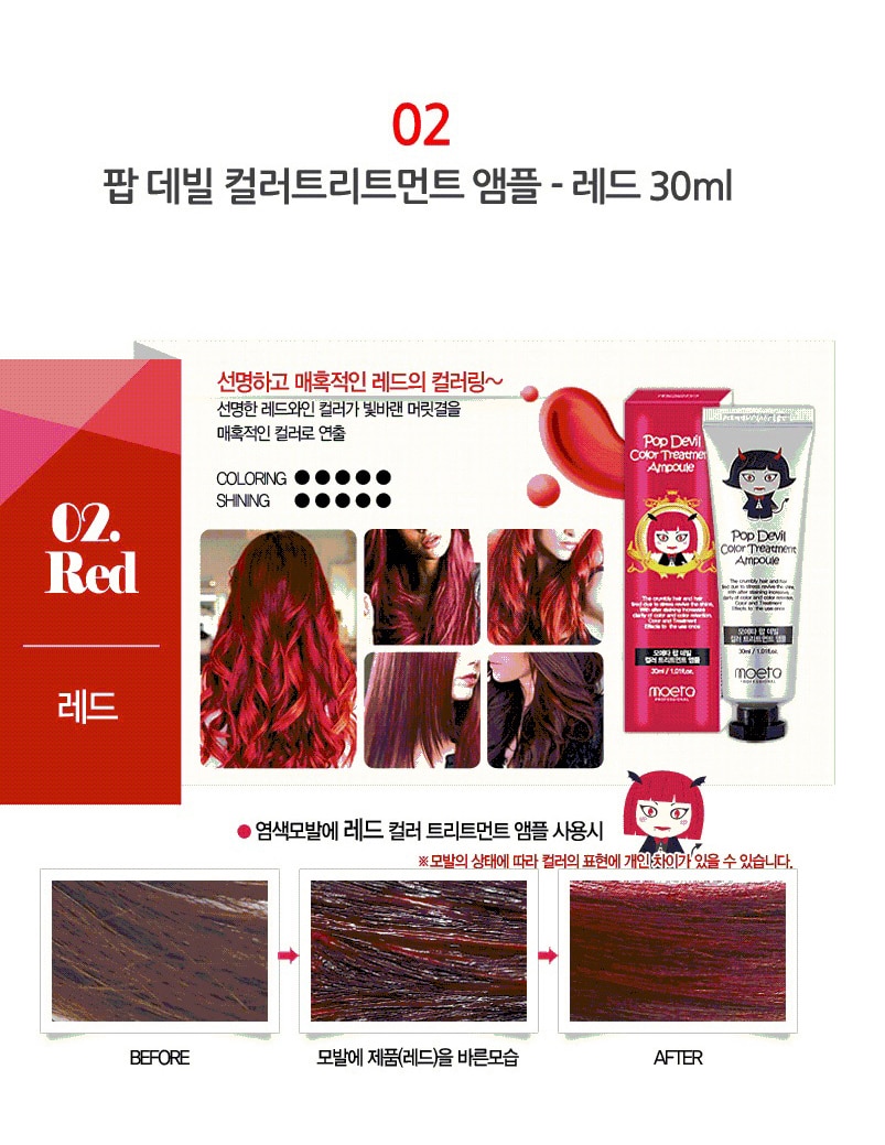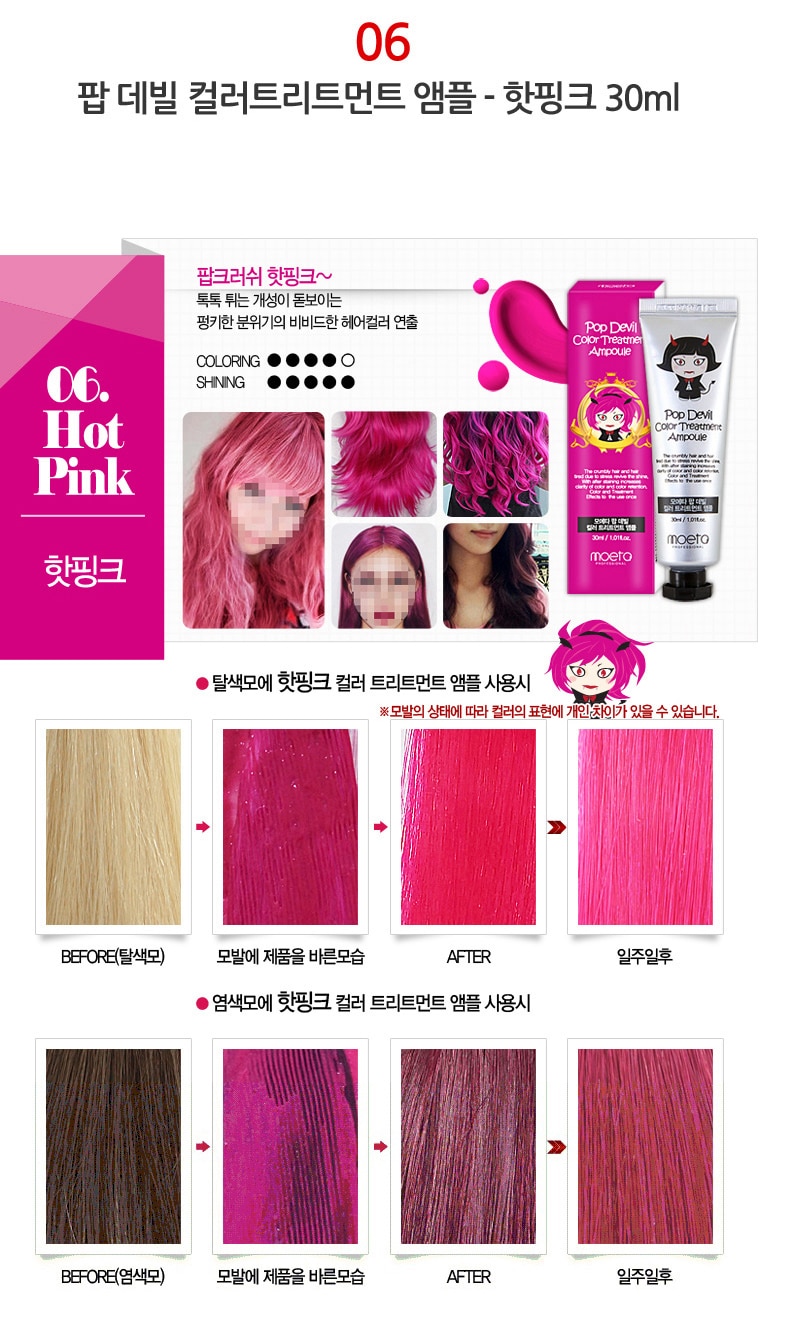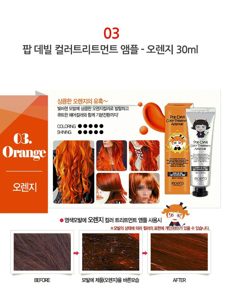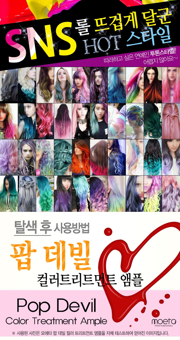 - MOETA POP DEVIL COLOR TREATMENT AMPOULE 魔鬼焗油染髮膏有護髮功能,令頭髮有柔順效果,髮色明顯能維持大約 2 – 3 個星期