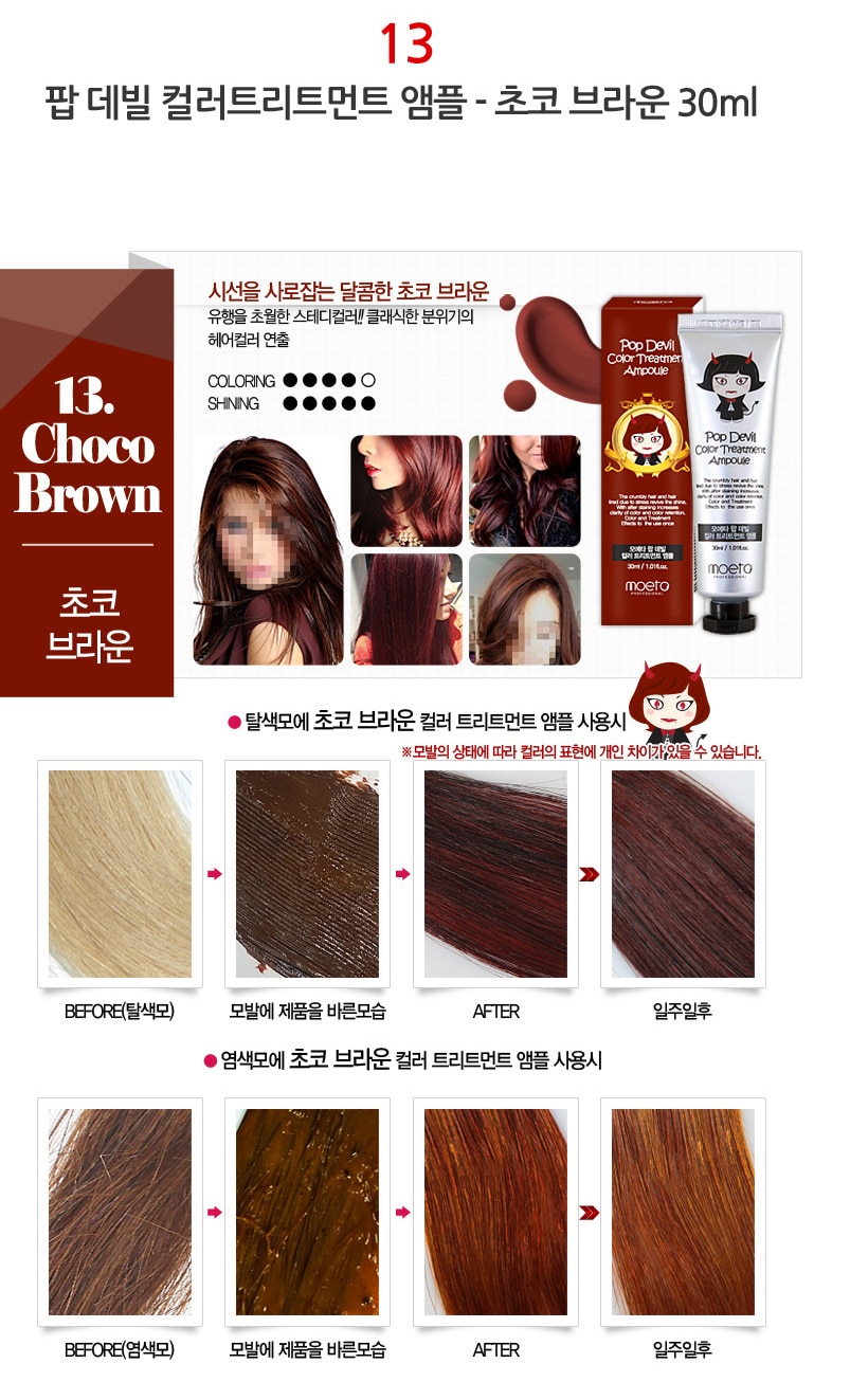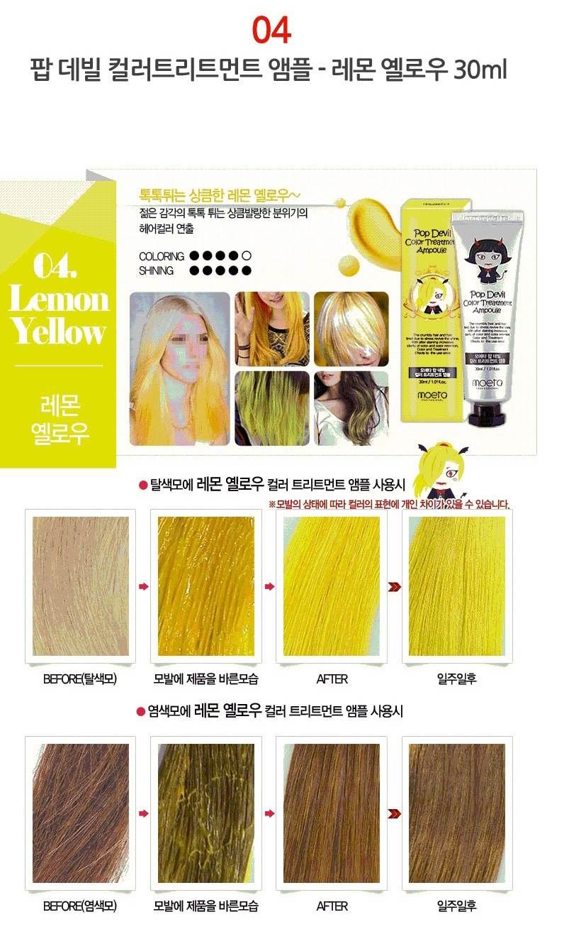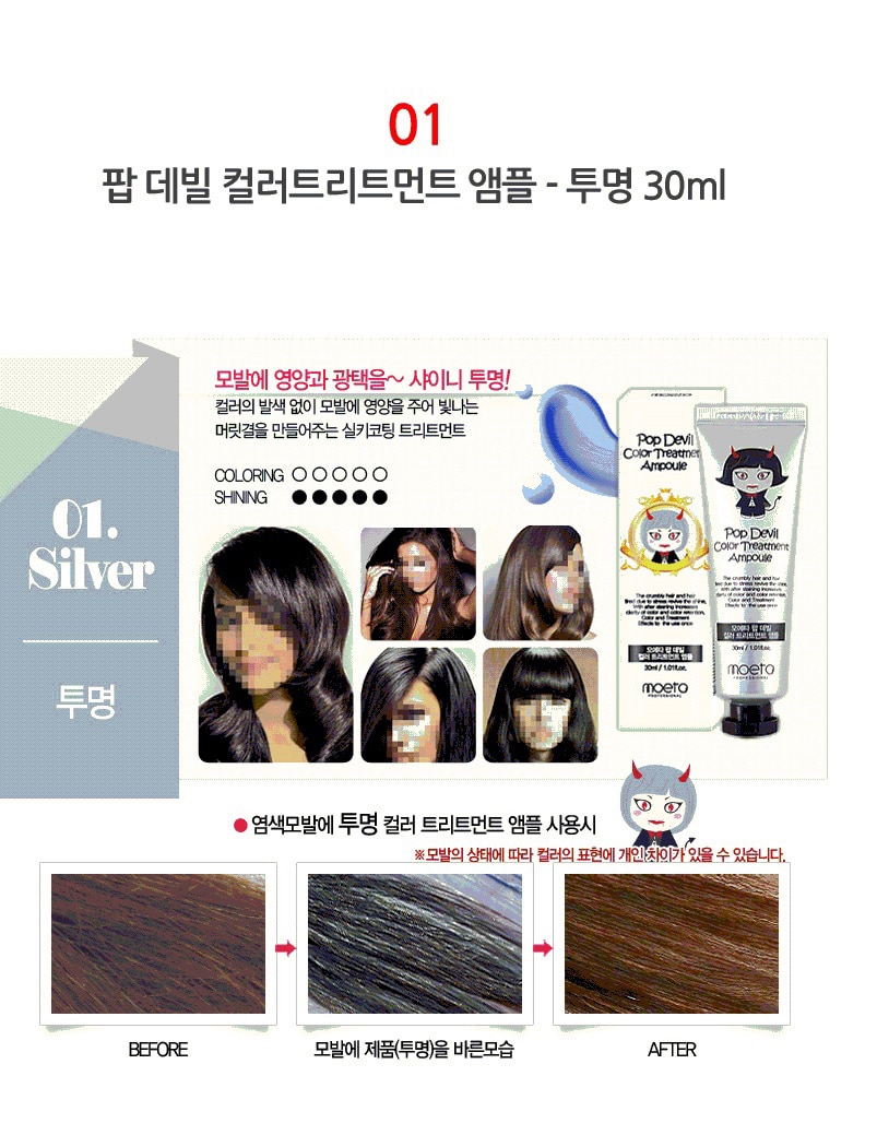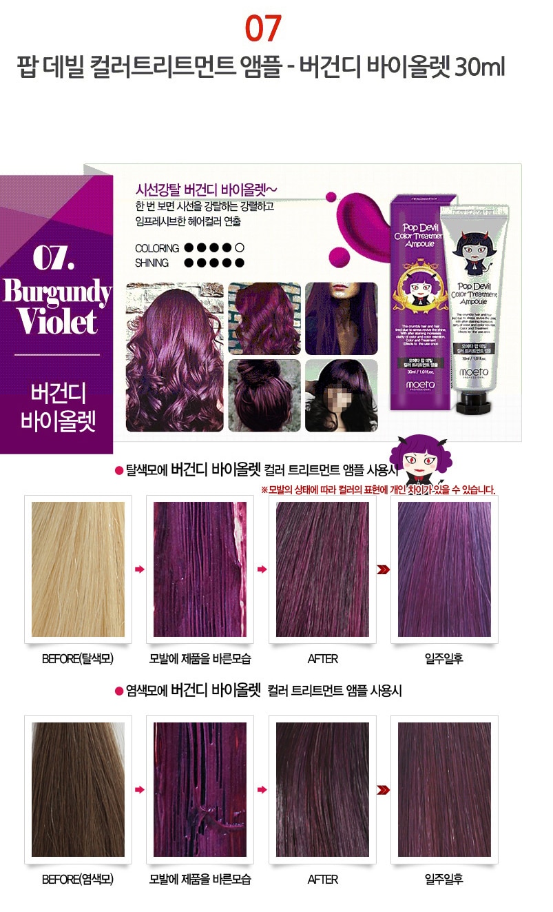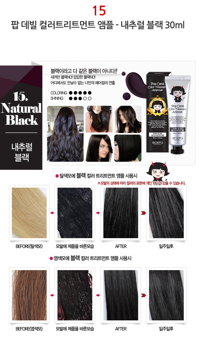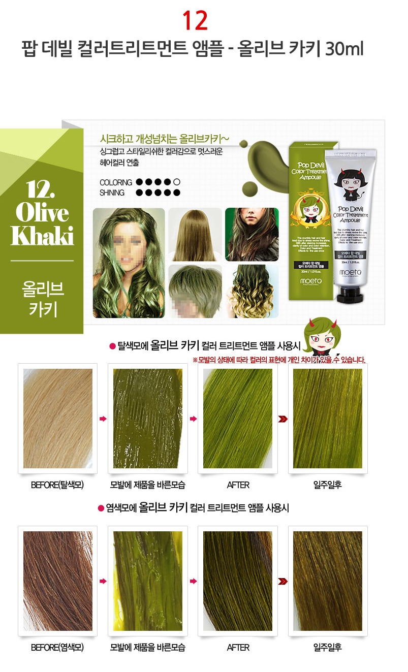 - MOETA POP DEVIL COLOR TREATMENT AMPOULE 魔鬼焗油染髮膏有護髮功能,令頭髮有柔順效果,髮色明顯能維持大約 2 – 3 個星期