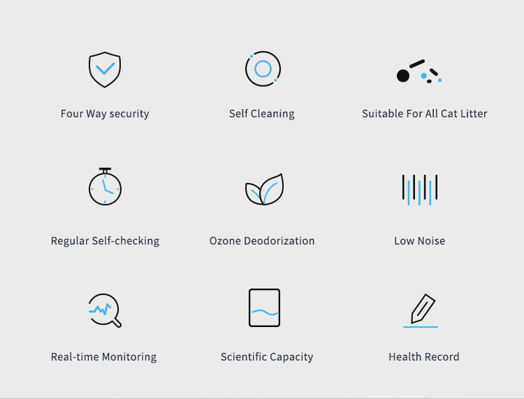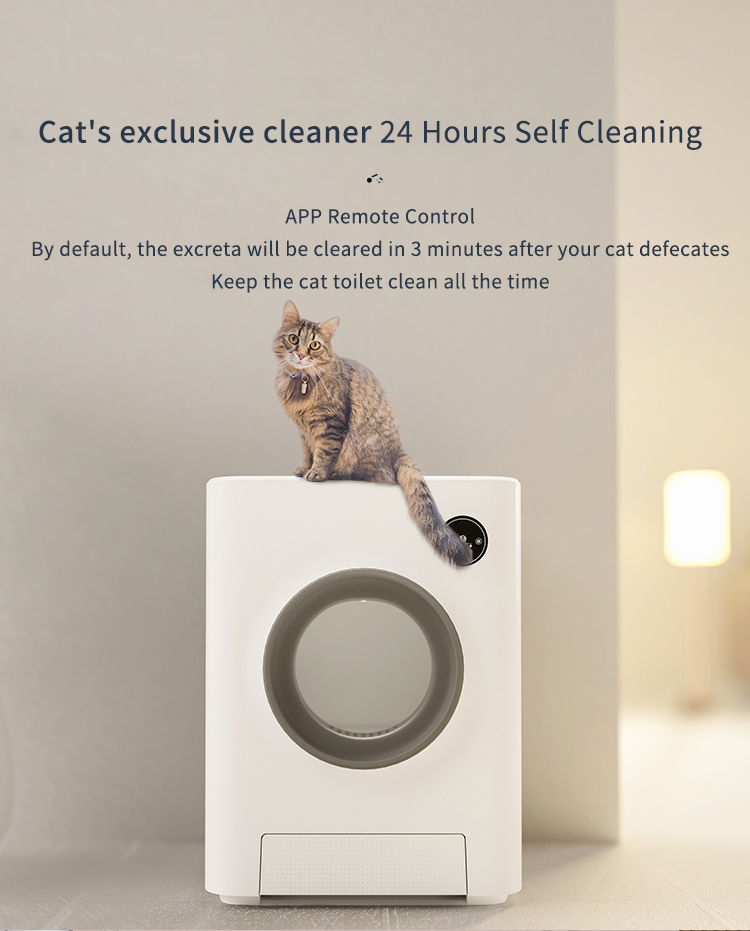 - PURA 清潔系統,貓咪如廁後,可設置 3 / 5 / 10 分鐘定時清理,讓貓砂可以包裹均勻,吸幹水分,一鏟即淨