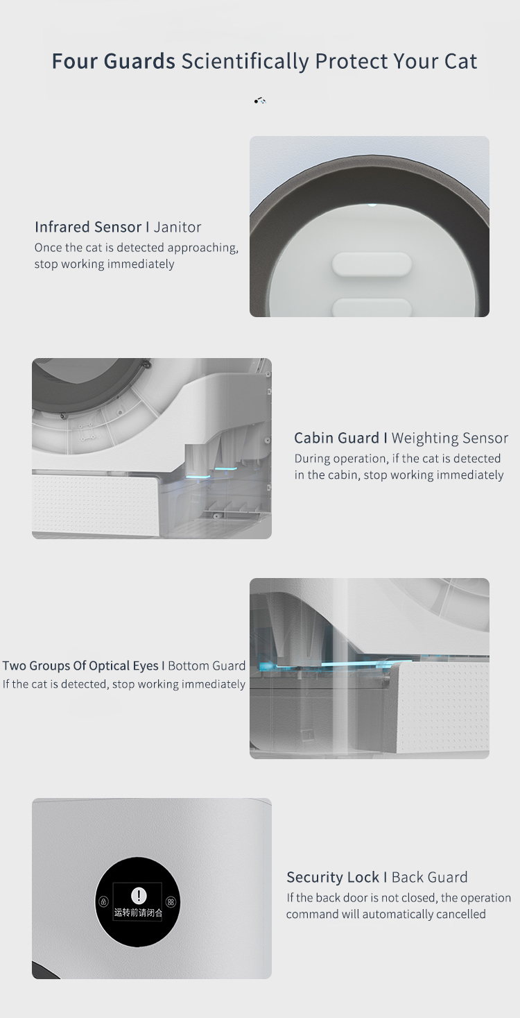- 第二重防護:搭配四組稱重感知,當鏟屎過程中檢測到貓咪進入,重量增加,則立即停止運行