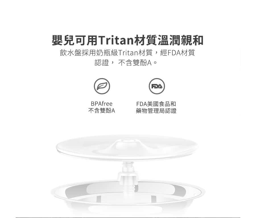 - 飲水盤採用嬰兒奶樽 Tritan 材質,經 FDA 認證不含 BPA