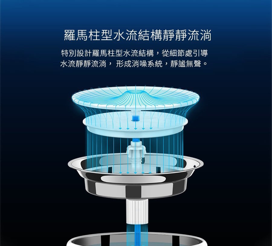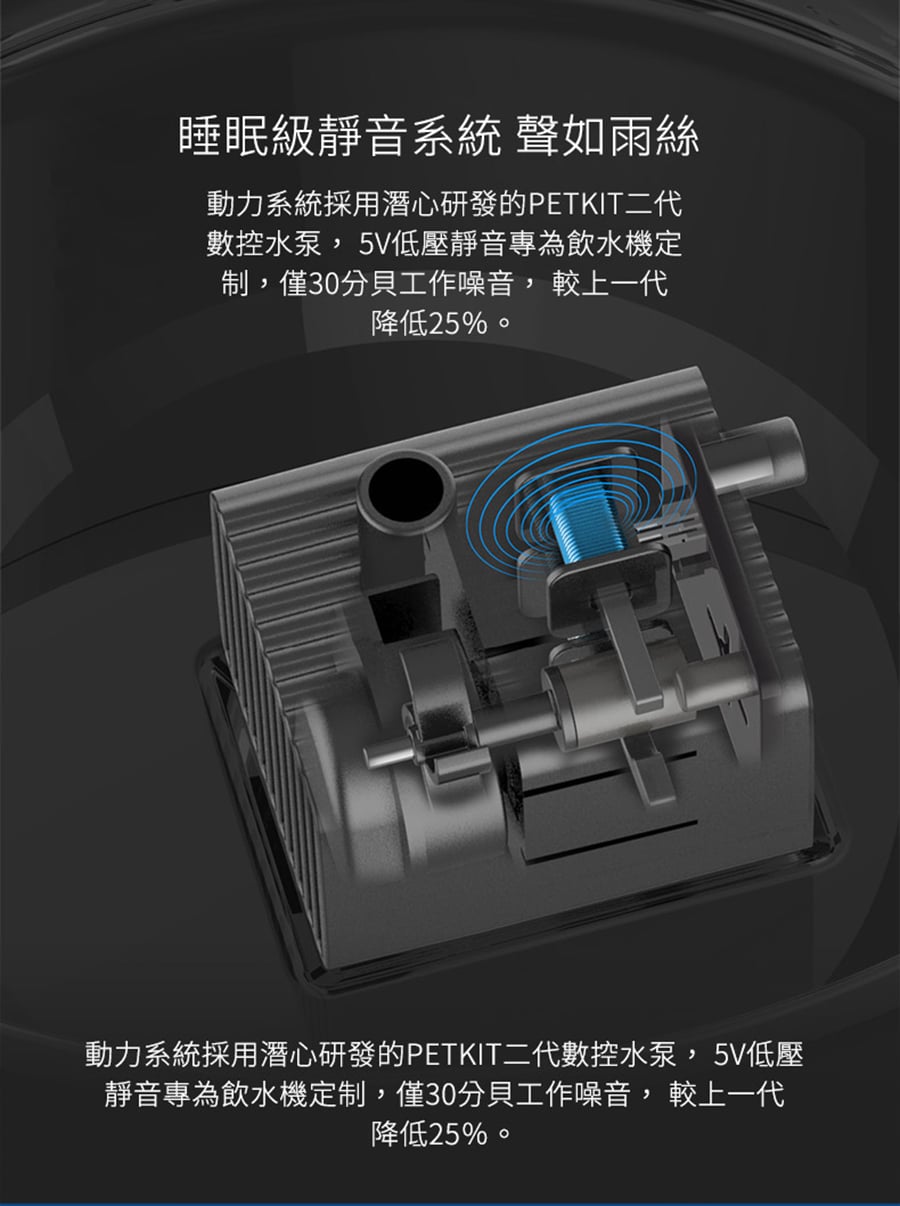 - 每日四次智能脈沖推浮毛,增壓噴湧,將飲水盤上浮毛推主濾芯,保持潔淨