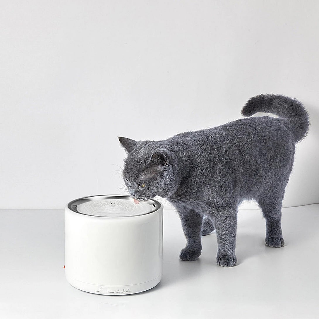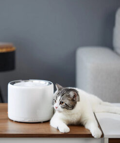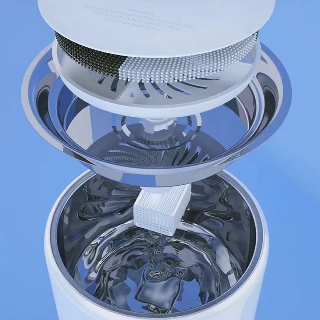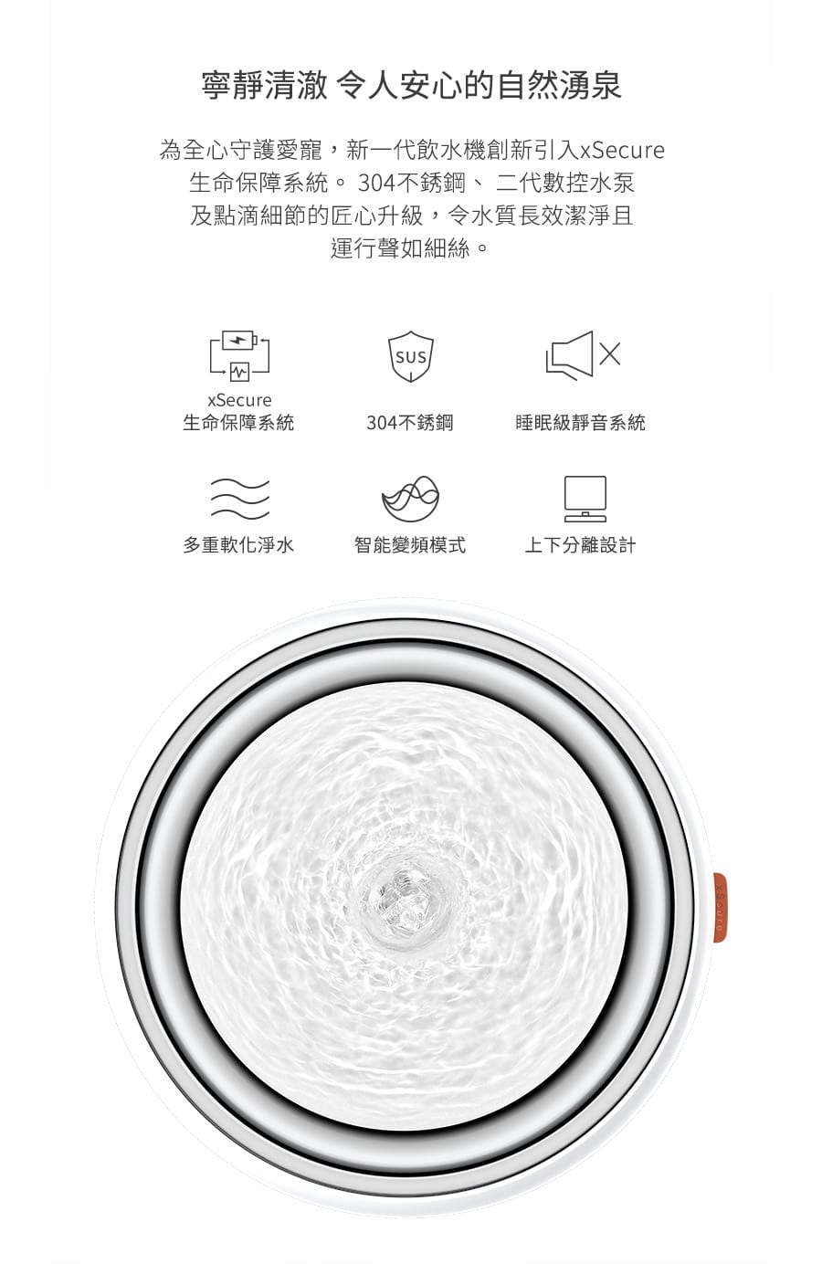 內置水位感應器,缺水時自動開啟斷電保護模式,防止水泵乾燒 - 上下分離式設計方便清洗及換水,飲水盤螺旋式鎖扣設計防止寵物損壞