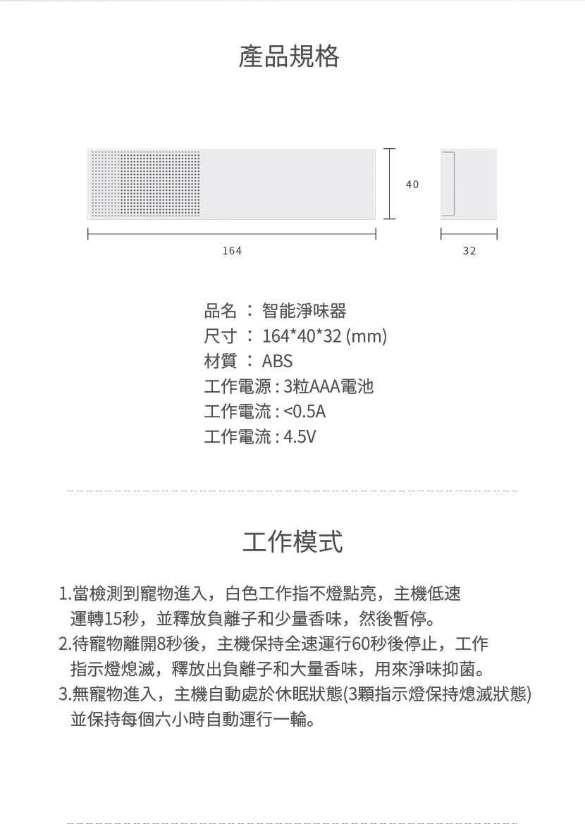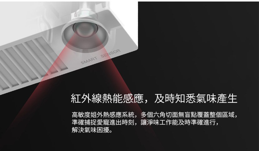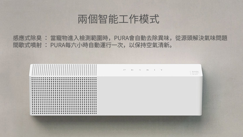 - 兩種模式同時運作:感應模式 – 當寵物進入紅外線感應範圍,即時散發香薰去除氣味 / 間歇模式 – 每 6 小時散發一次以保持空氣清新