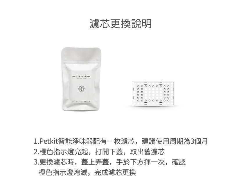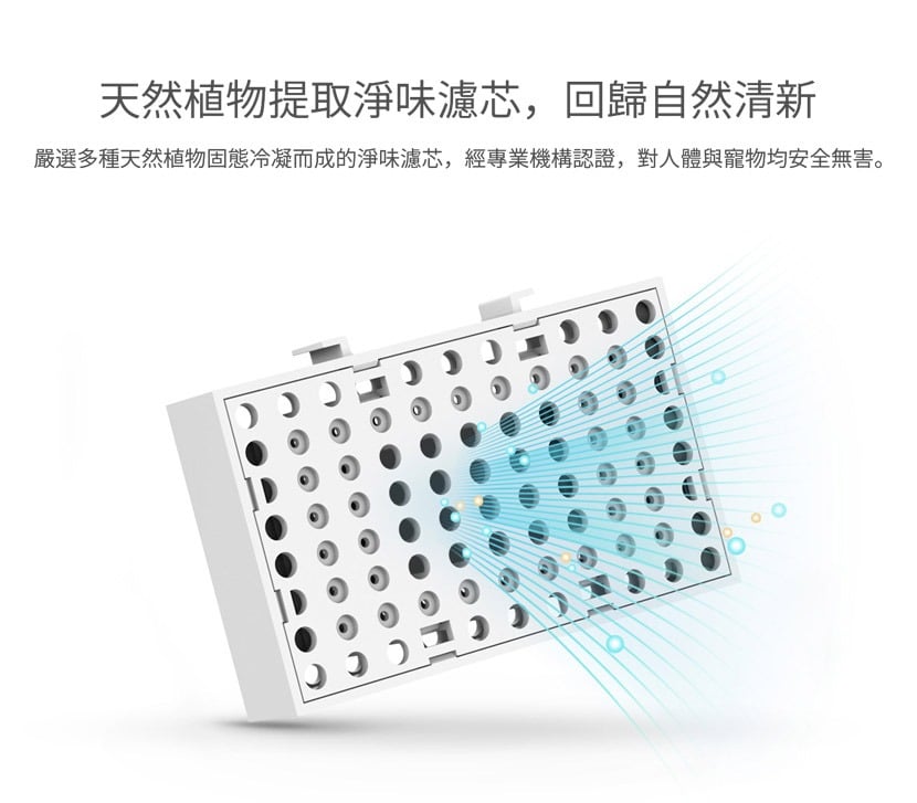 - 香薰濾芯由 20 種天然植物提取,無毒無害,有效中和寵物排泄物中的氨氣和硫化氫等氣味分子,使其結構產生變化,抑制異味及細菌產生,發放清新香氣