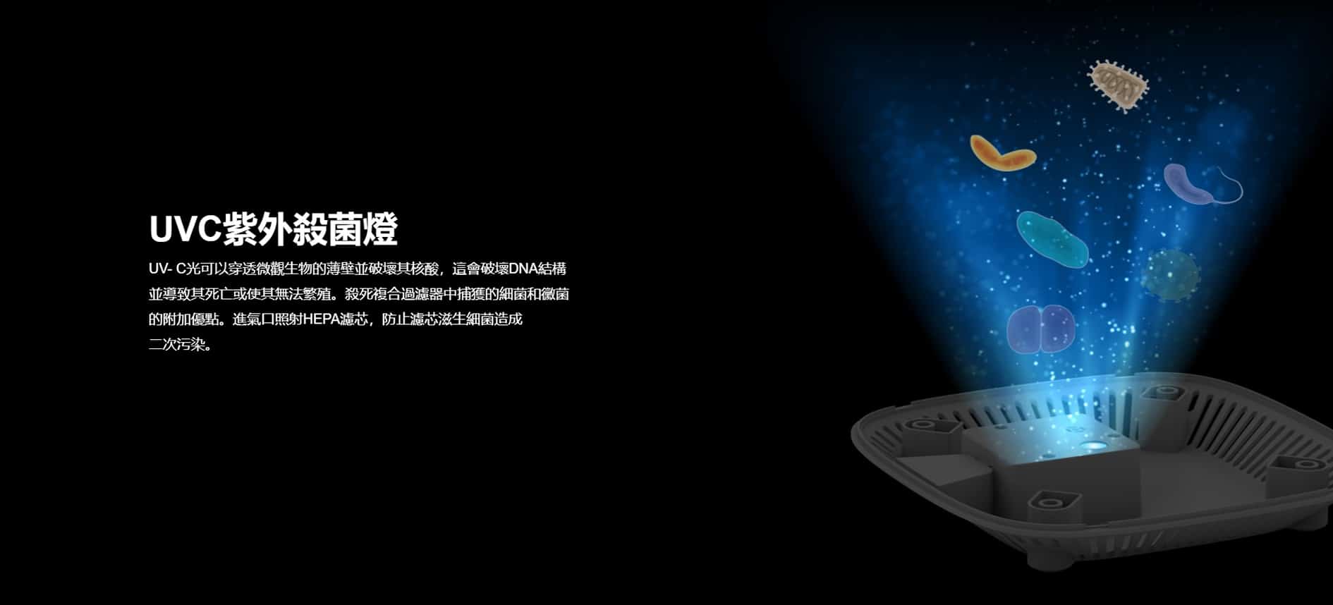 - UV- C 光可以穿透微觀生物的薄壁並破壞其核酸,這會破壞 DNA 結構並導致其死亡或使其無法繁殖。殺死複合過濾器中捕獲的細菌和黴菌的附加優點。進氣口照射 HEPA 濾芯,防止濾芯滋生細菌造成二次污染