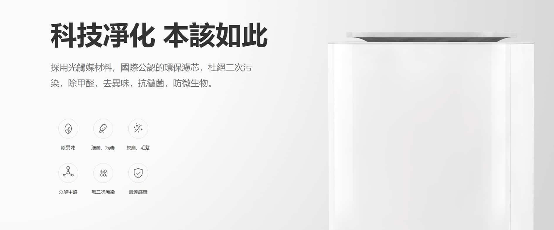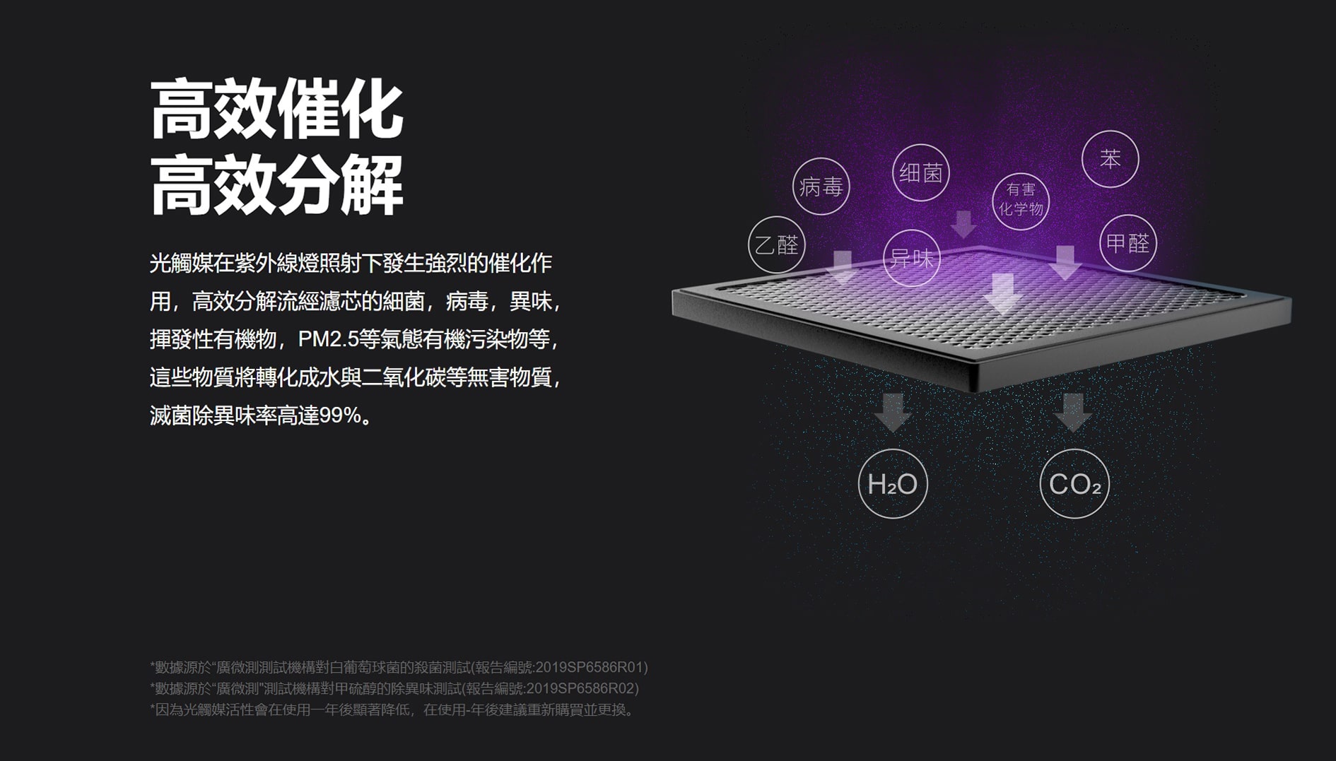 - 光觸媒在紫外線燈照射下發生強烈的催化作用,高效分解流經濾芯的細菌,病毒,異味,揮發性有機物,PM 2.5 等氣態有機污染物等,這些物質將轉化成水與二氧化碳等無害物質,滅菌除異味率高達 99%