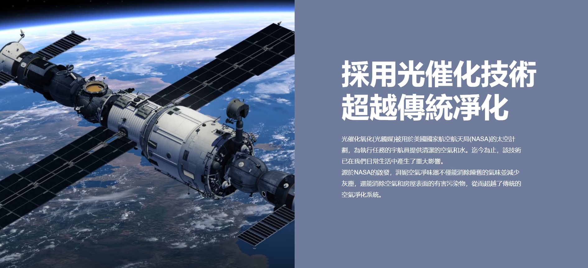 - 光催化氧化 (光觸媒) 被用於美國國家航空航天局 (NASA) 的太空計劃,為執行任務的宇航員提供清潔的空氣和水。迄今為止,該技術已在我們日常生活中產生了重大影響