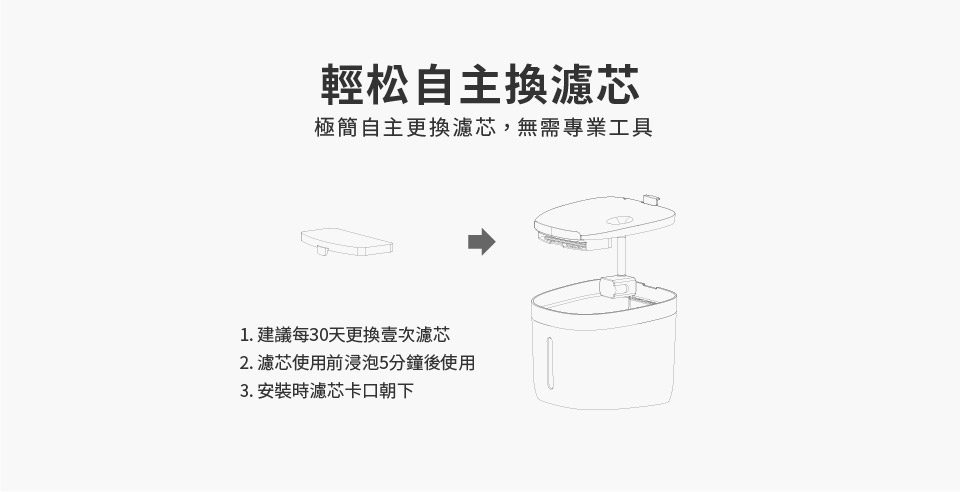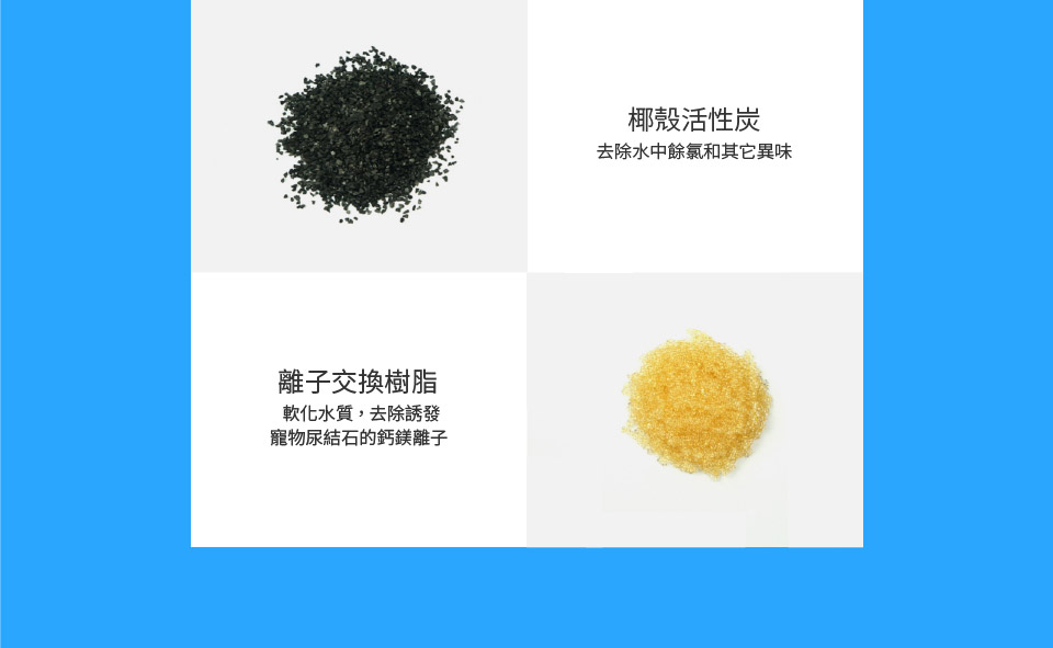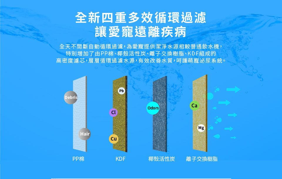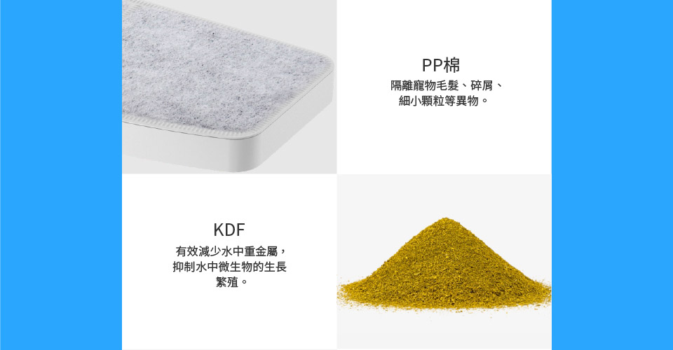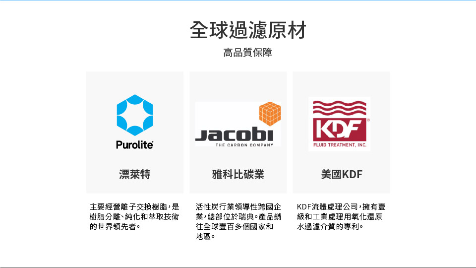 • 特別增加了由 PP 棉、椰殼活性炭、離子交換樹脂、KDF 組成的高密度濾芯