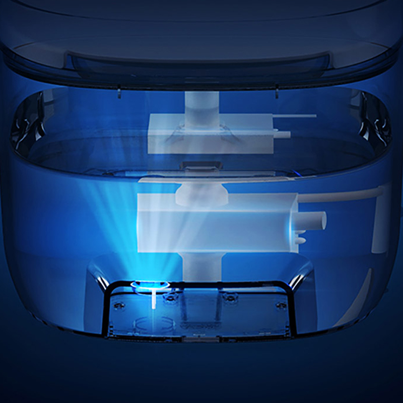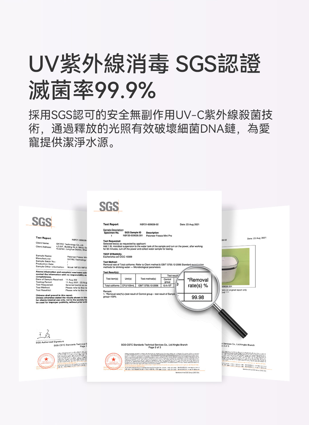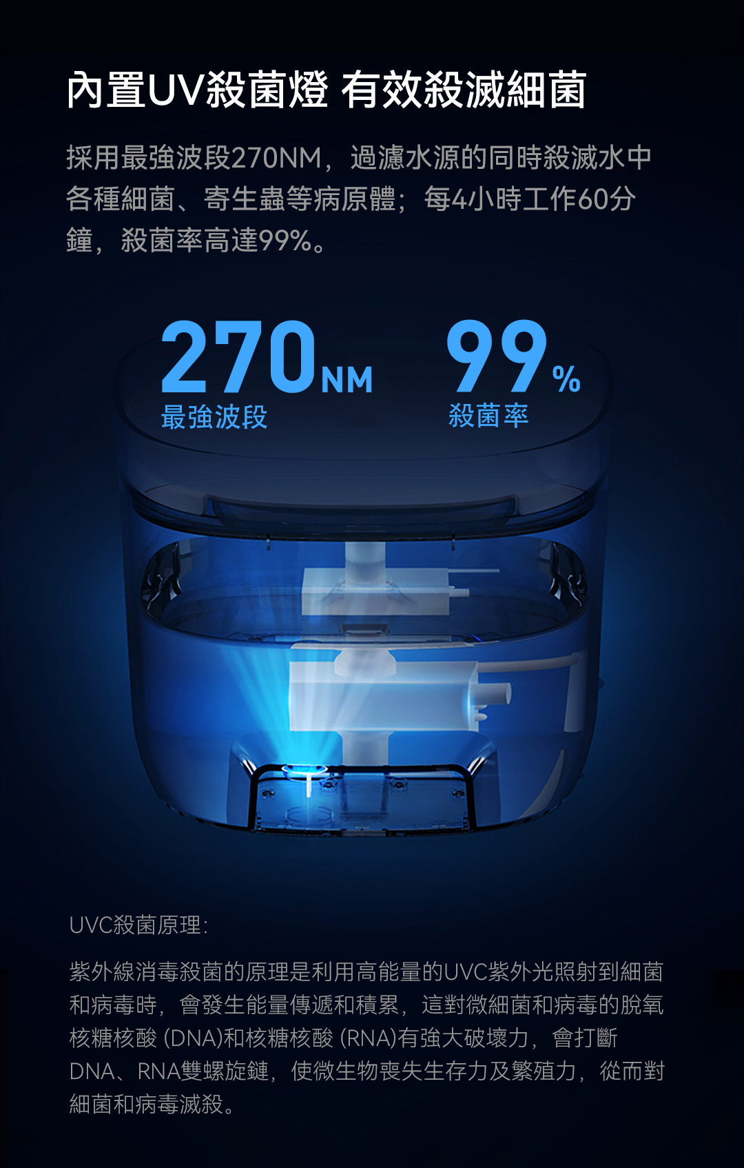 - 水機內置 UV 殺菌燈,採用了 UVC 最長波段 270NM,過濾水源同時殺滅水中各種細菌、寄生蟲等病原體,水機每 4 個小時開啟 UV 殺菌功能 60 分鐘,殺菌率高達 99.9%