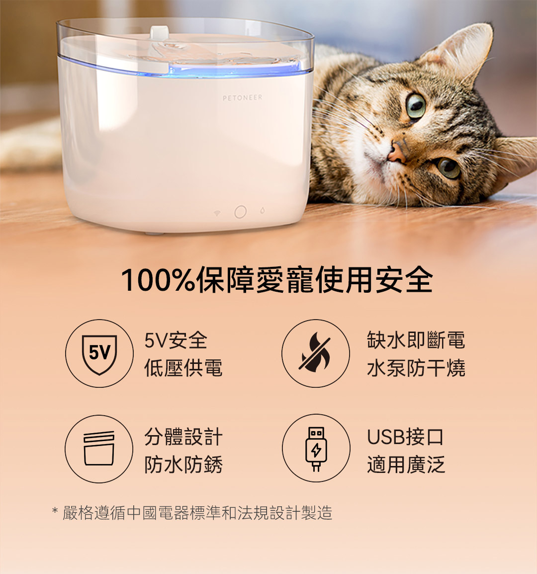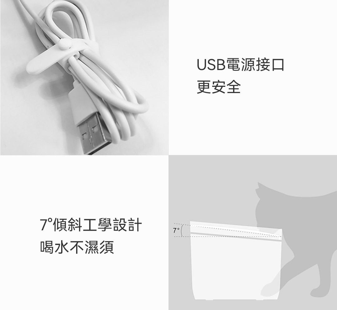 - 100% 保障愛寵安全。採用USB 接口;5V 安全低壓供電;缺水立即斷電;水泵自帶防乾燒功能;主機分體設計;防水同時亦能防生銹