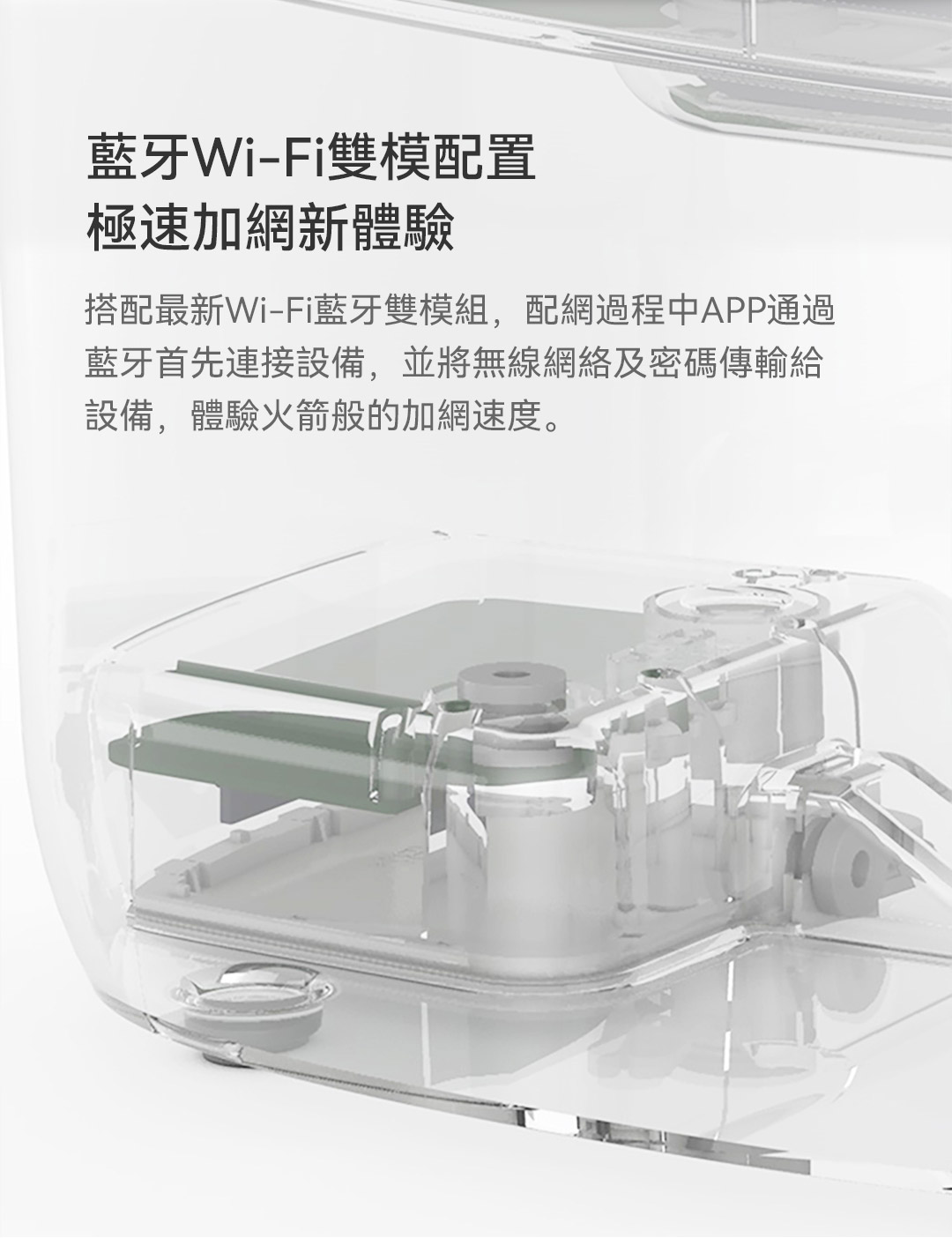 - 搭配了最新的 WIFI 藍牙雙模組,配網過程中 APP 首先連接設備,並將無線網路及密碼傳輸給設備,體驗火箭般的加網速度