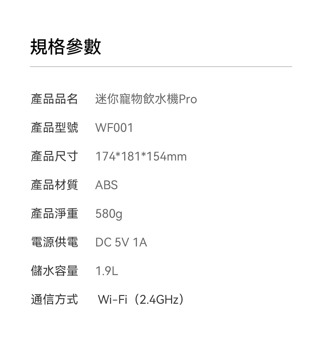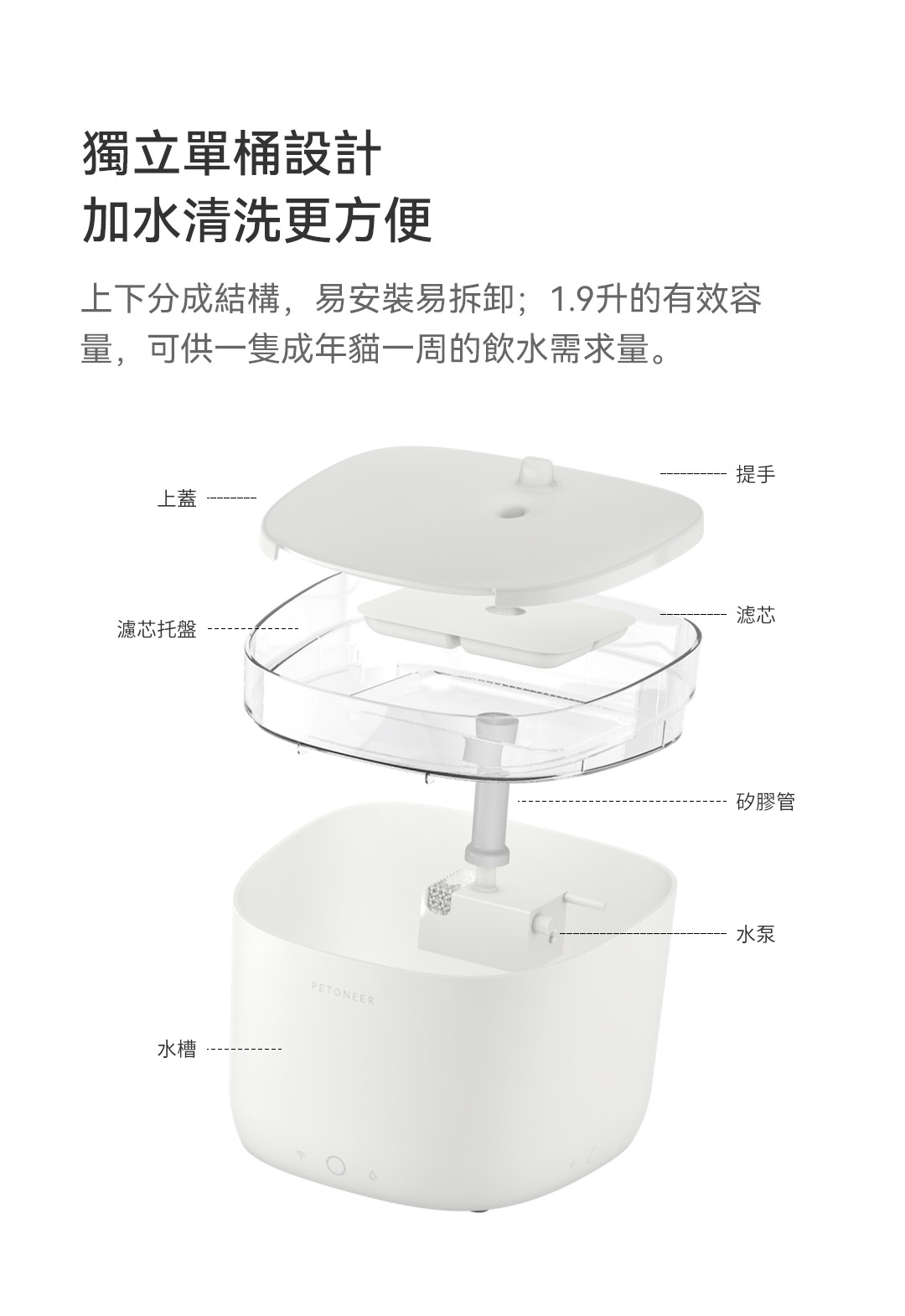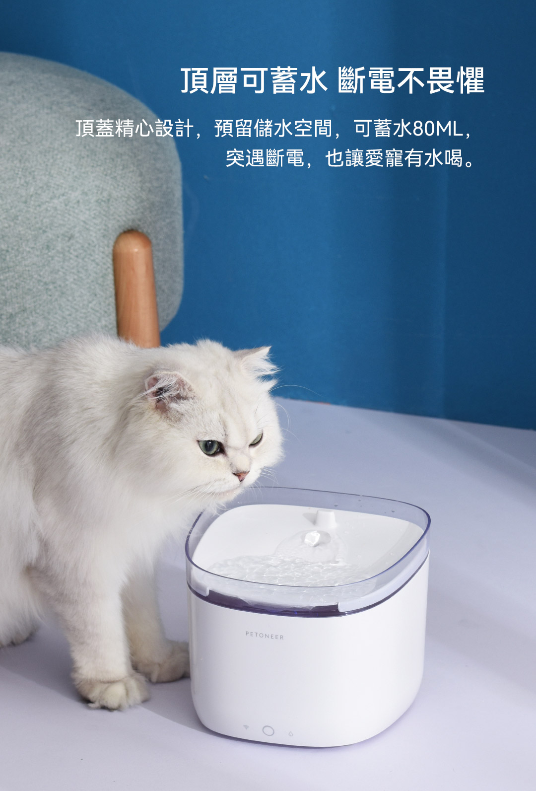 - 無懼突發的斷電,頂蓋精心設計,預留了 80ML 的儲水空間,突遇斷電也能讓愛寵有水喝