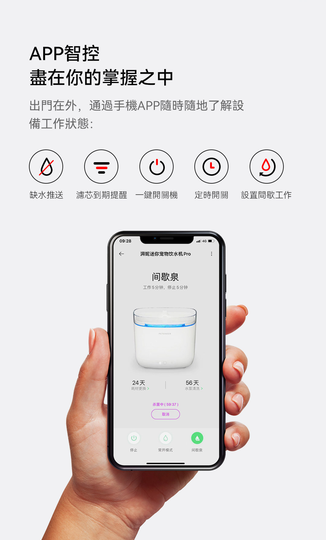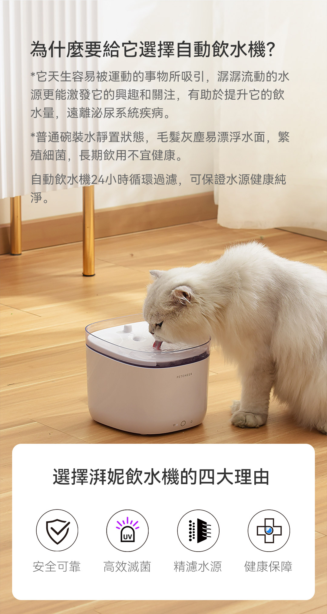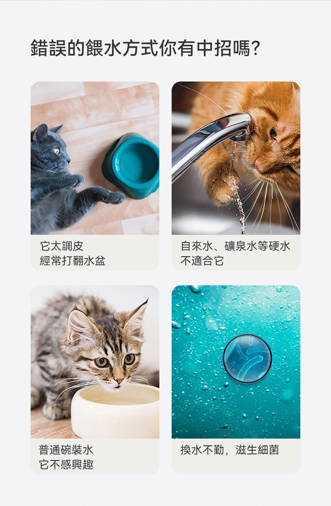 - 寵物天生容易被流動的事物所吸引,流動的水源更能激發牠們的興趣和關注,有助於提升牠的飲水量,遠離泌尿系統疾病